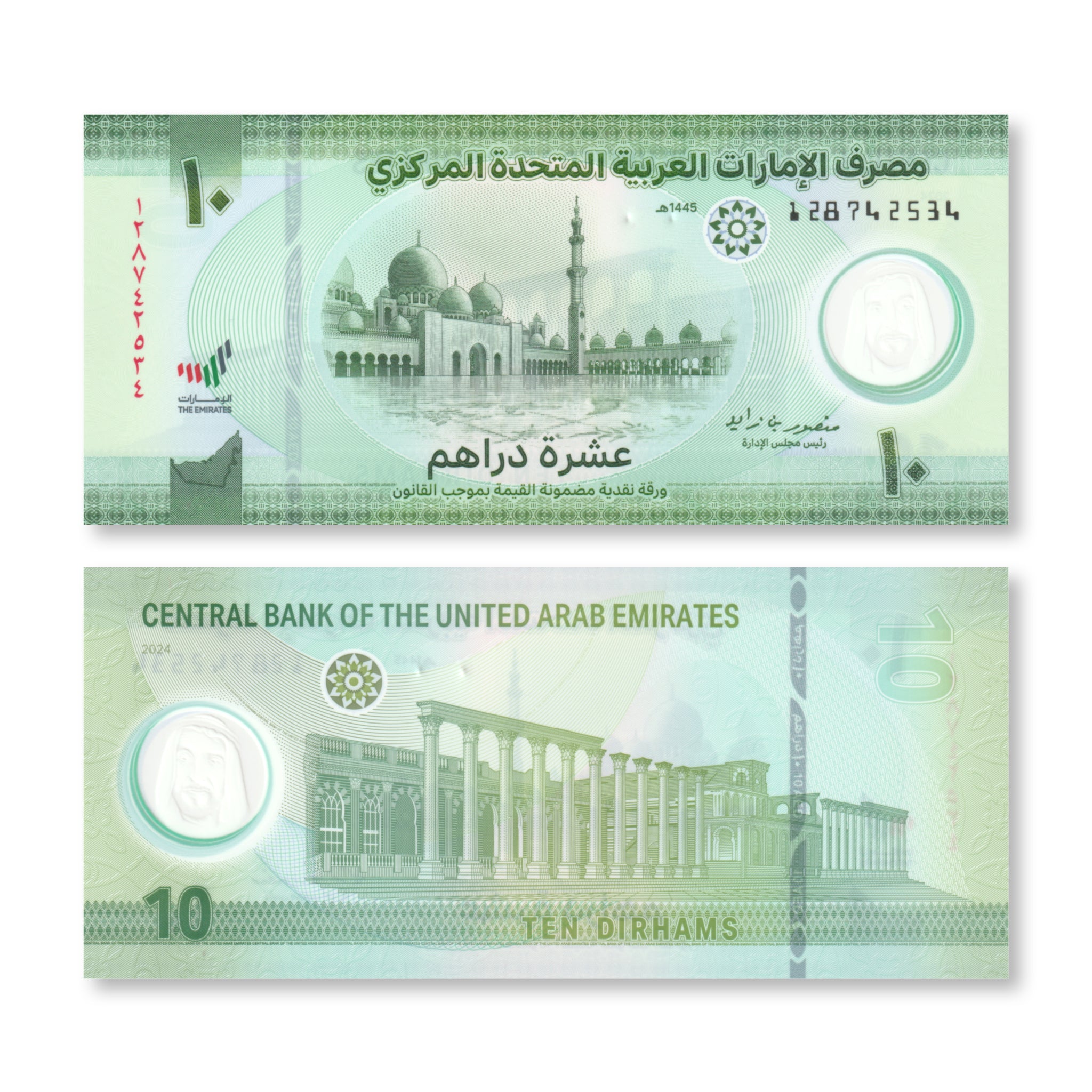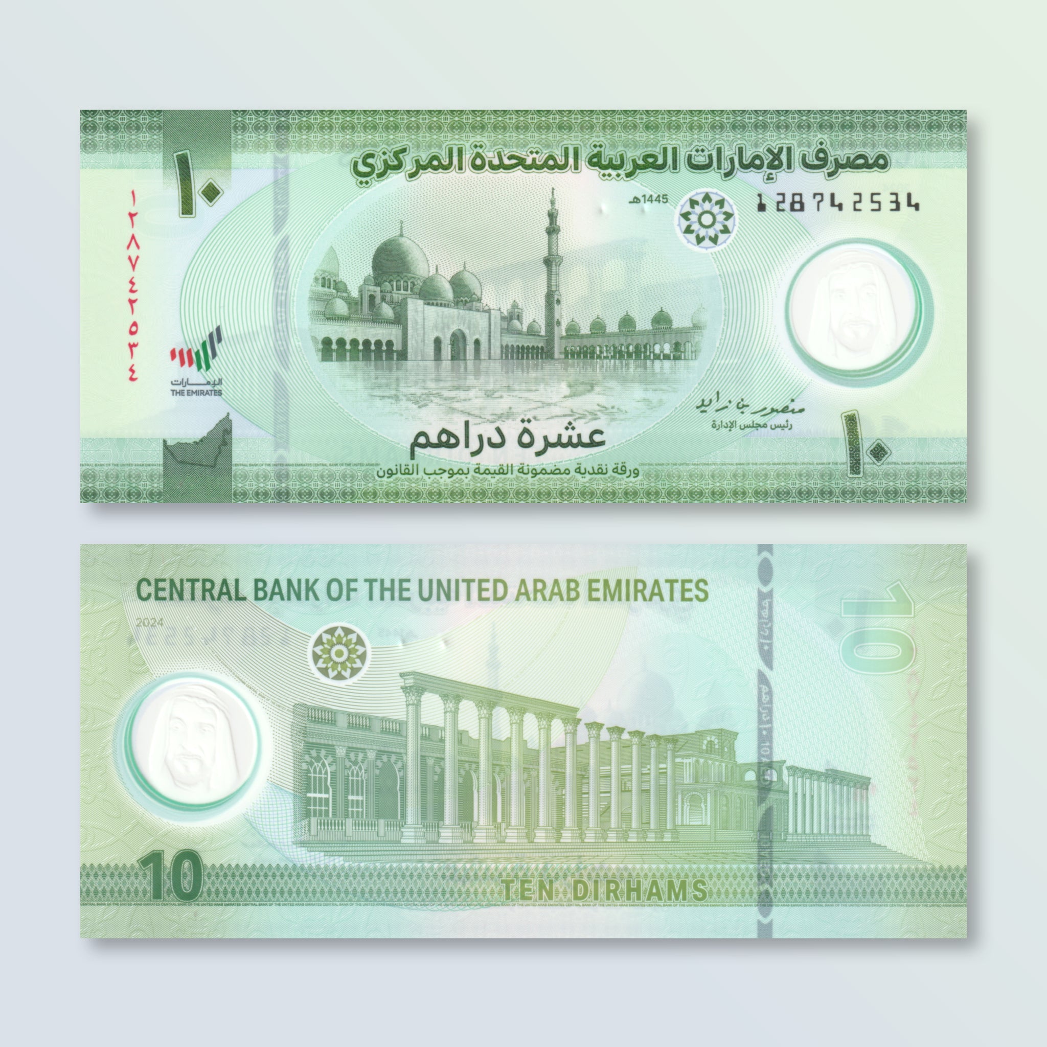 Front: Sheikh Zayed Grand Mosque in Abu Dhabi; rosette as registration device; Sheikh Zayed bin Sultan al-Nahyan.