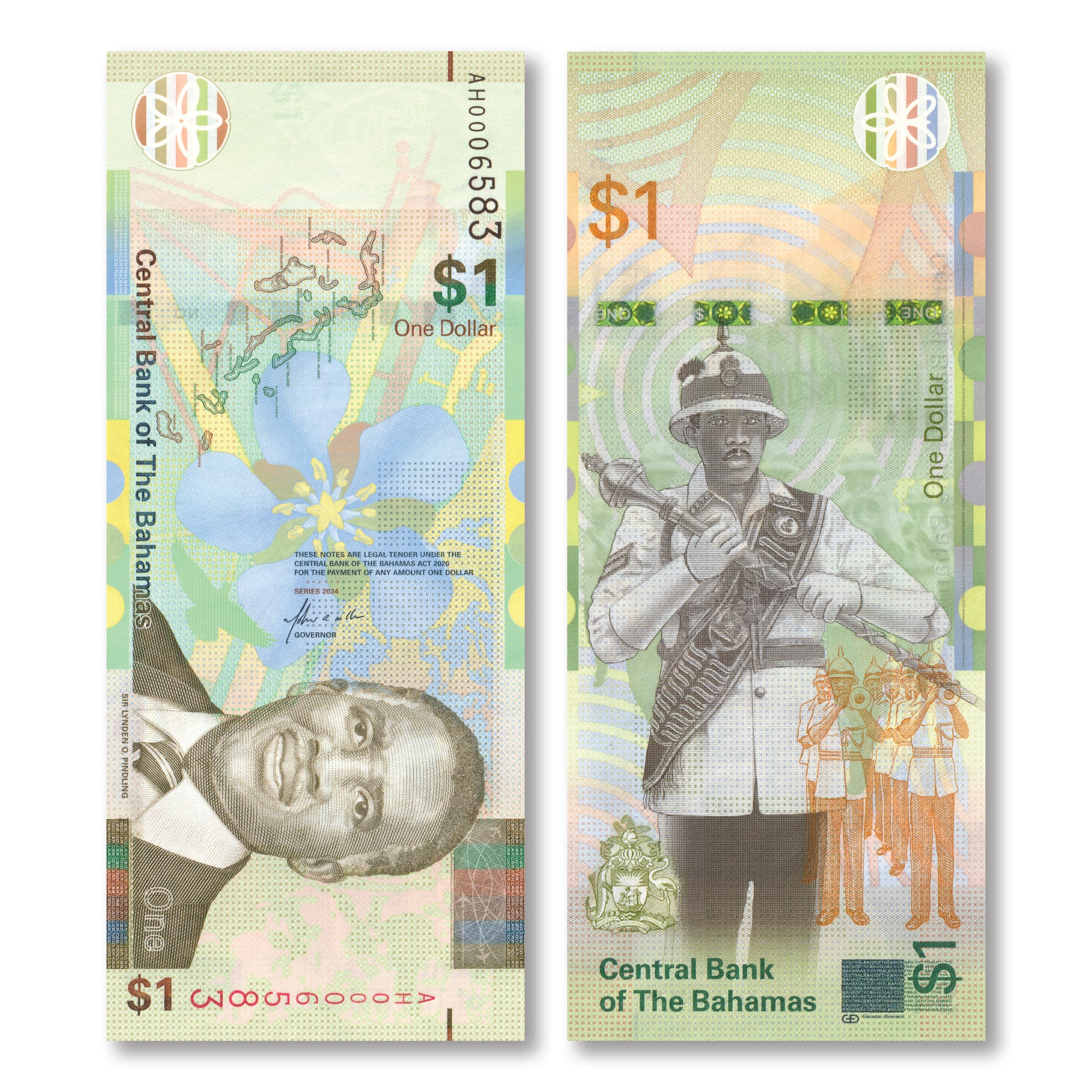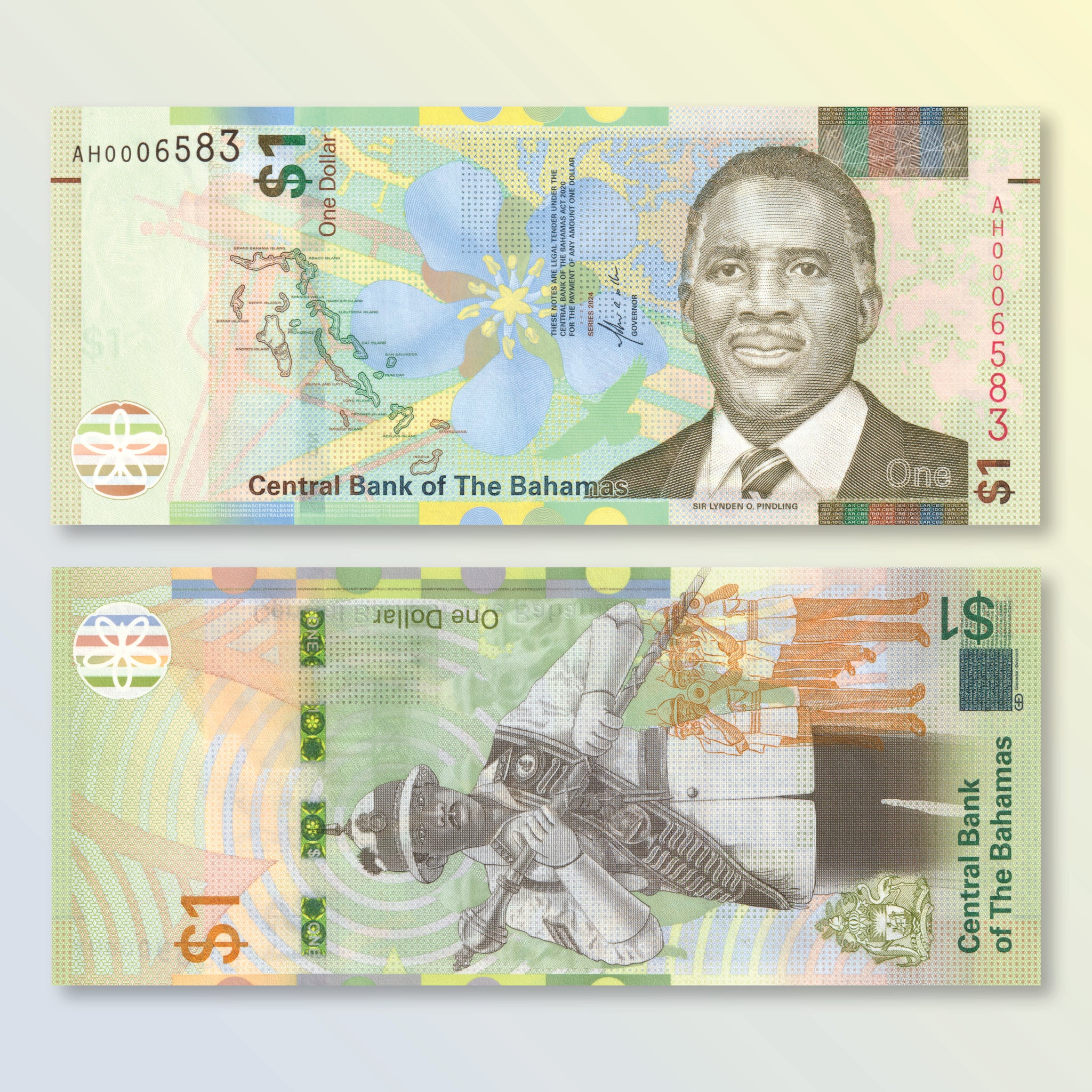 Front: Portrait of Sir Lynden Pindling, former prime minister and "Father of the Nation," leading Bahamas to independence in 1967. Lignum vitae flower from the national tree of the Bahamas. A flying owl in green iridescent ink. Map of the Bahamas.