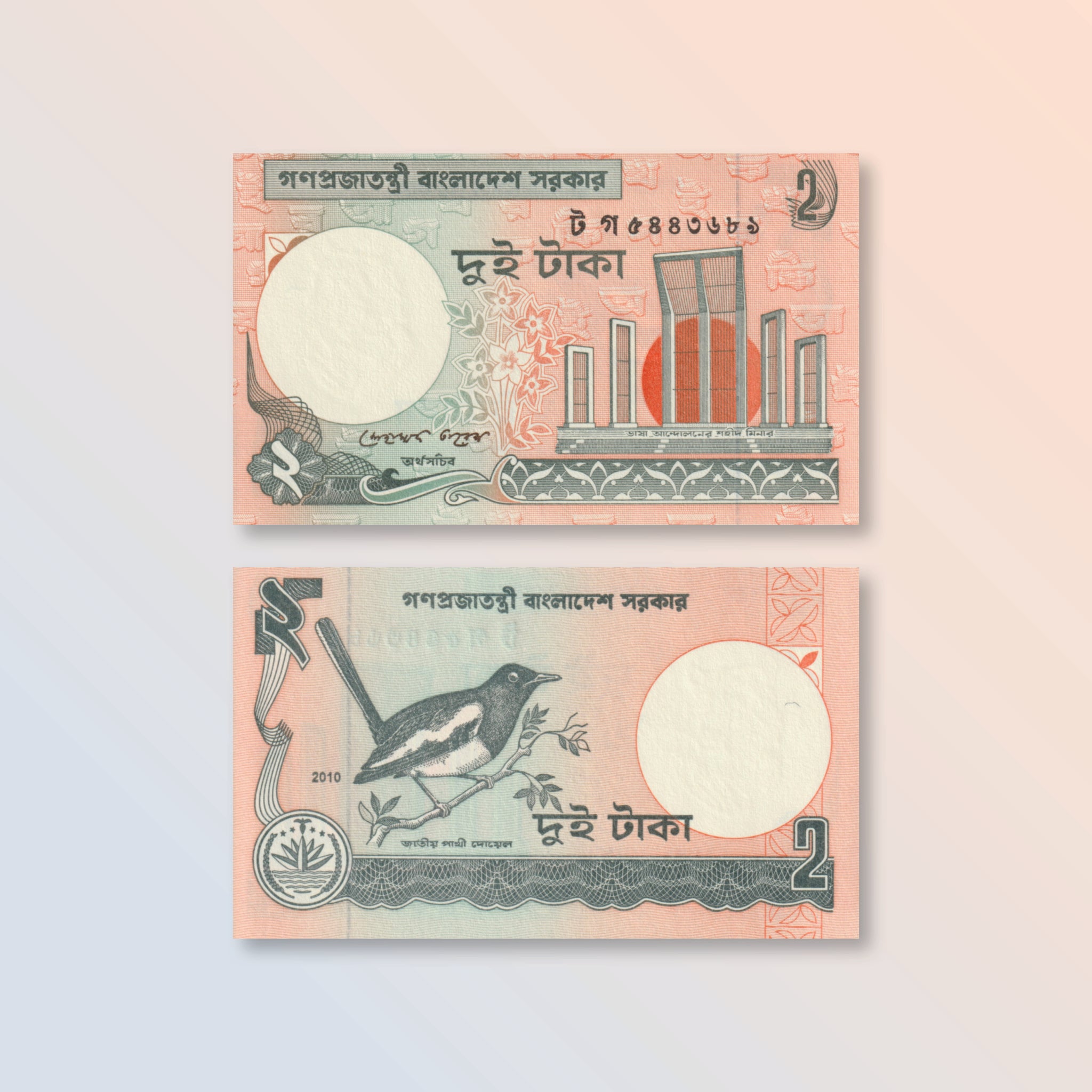 Front: Portrait of Sheikh Mujibur Rhaman; National Martyrs' Monument in Savar; national emblem with shapla flowwer, rice and jute.