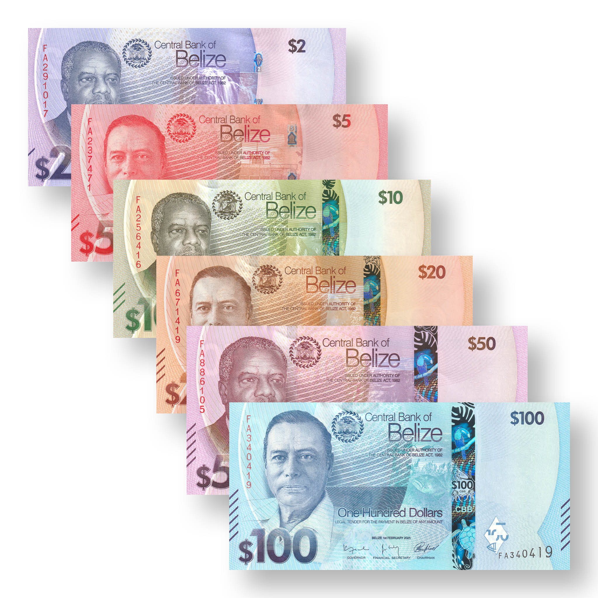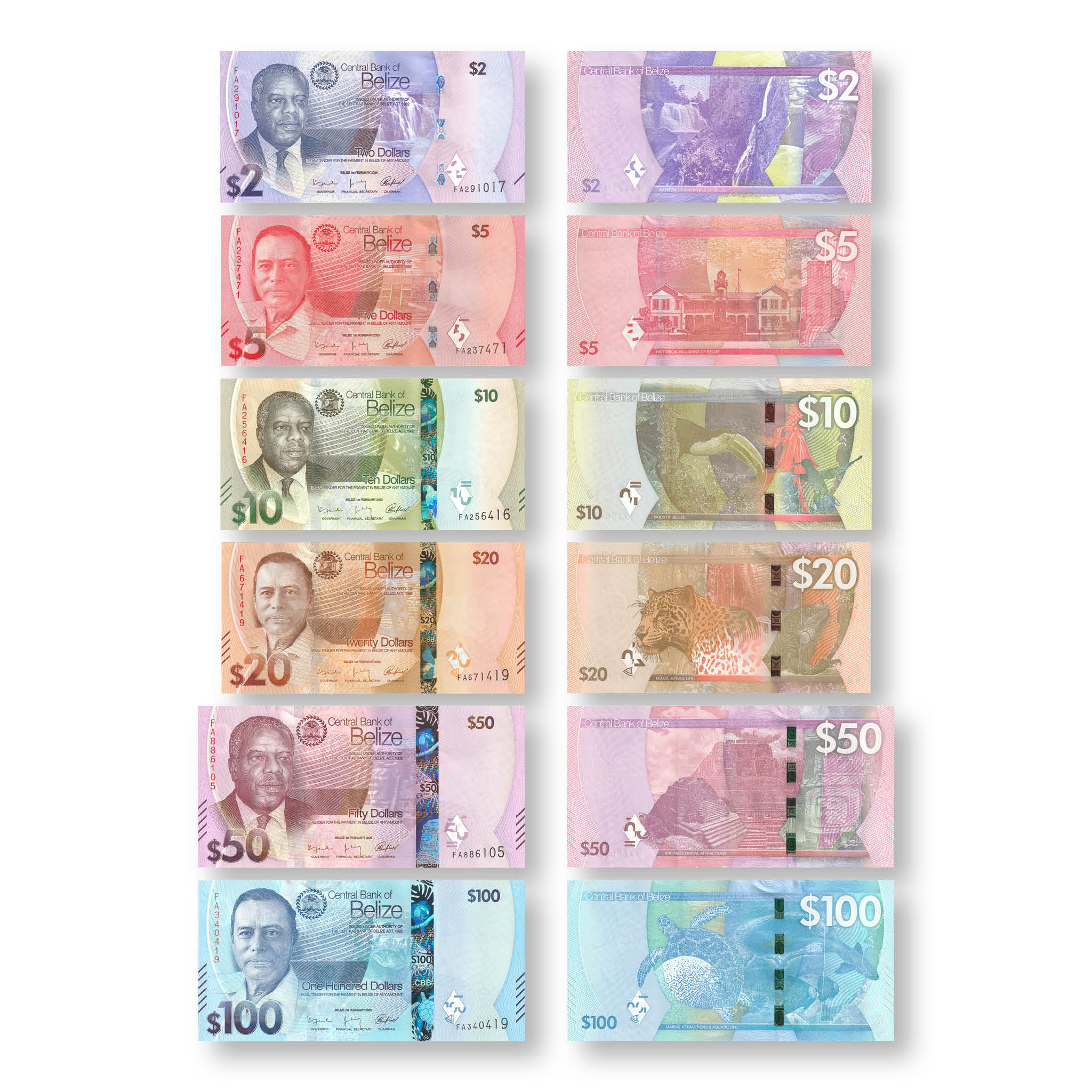Released August 2025, this is Belize's first banknote series without the British monarch appearing on them