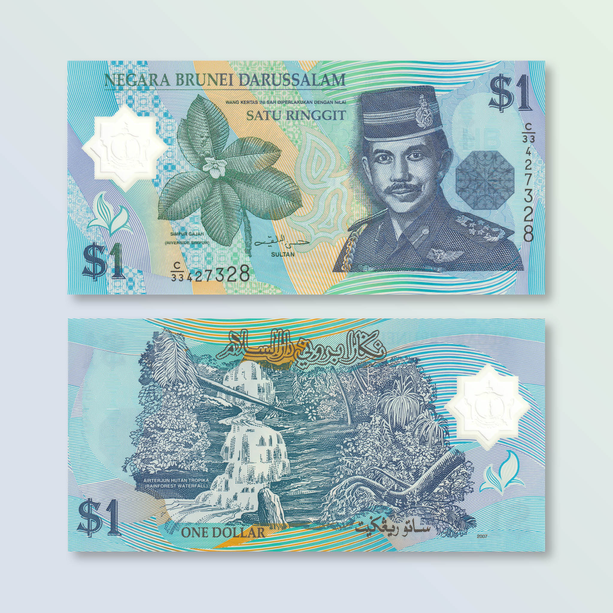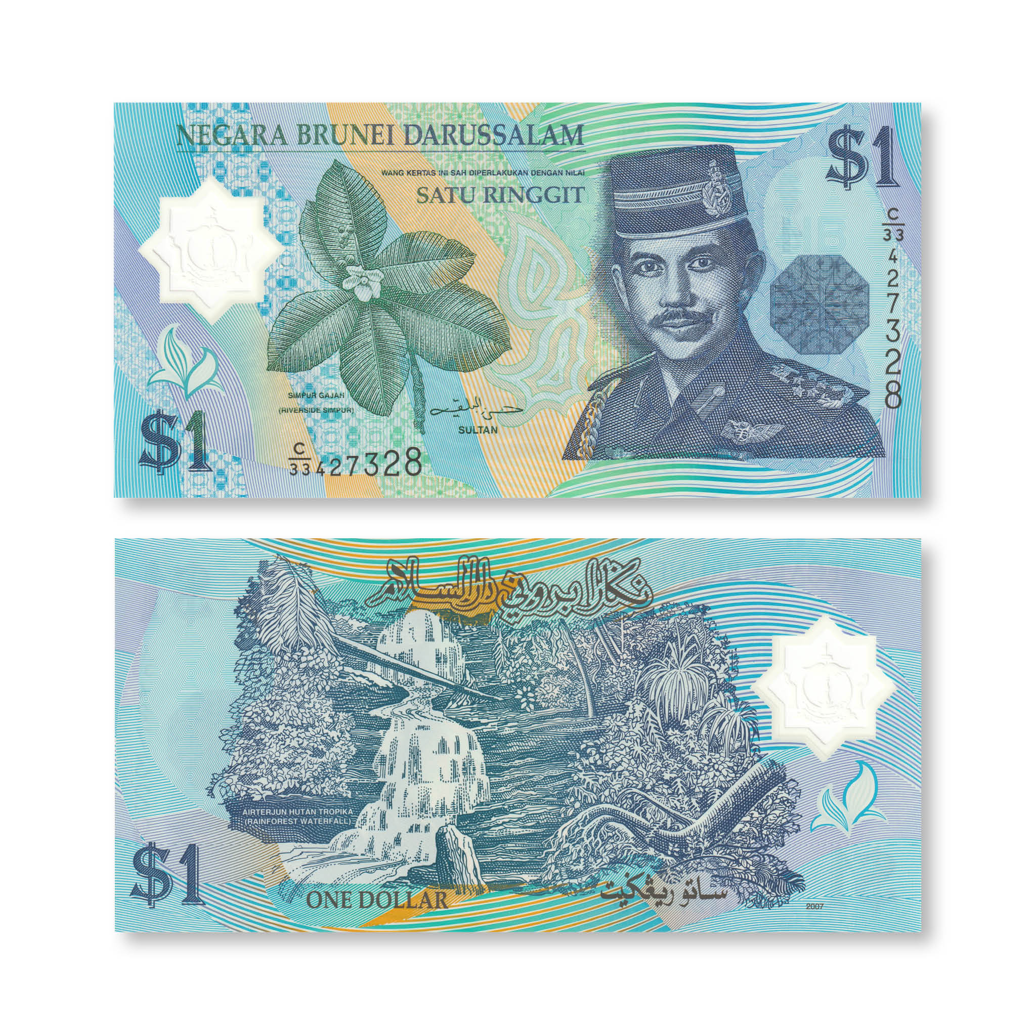 Front: Portrait of Sultan Hassanal Bolkiah Mu'izzaddin Waddaulah wearing a military uniform and songkok headgear; coat of arms; simpur gajah (riverside simpur flower).