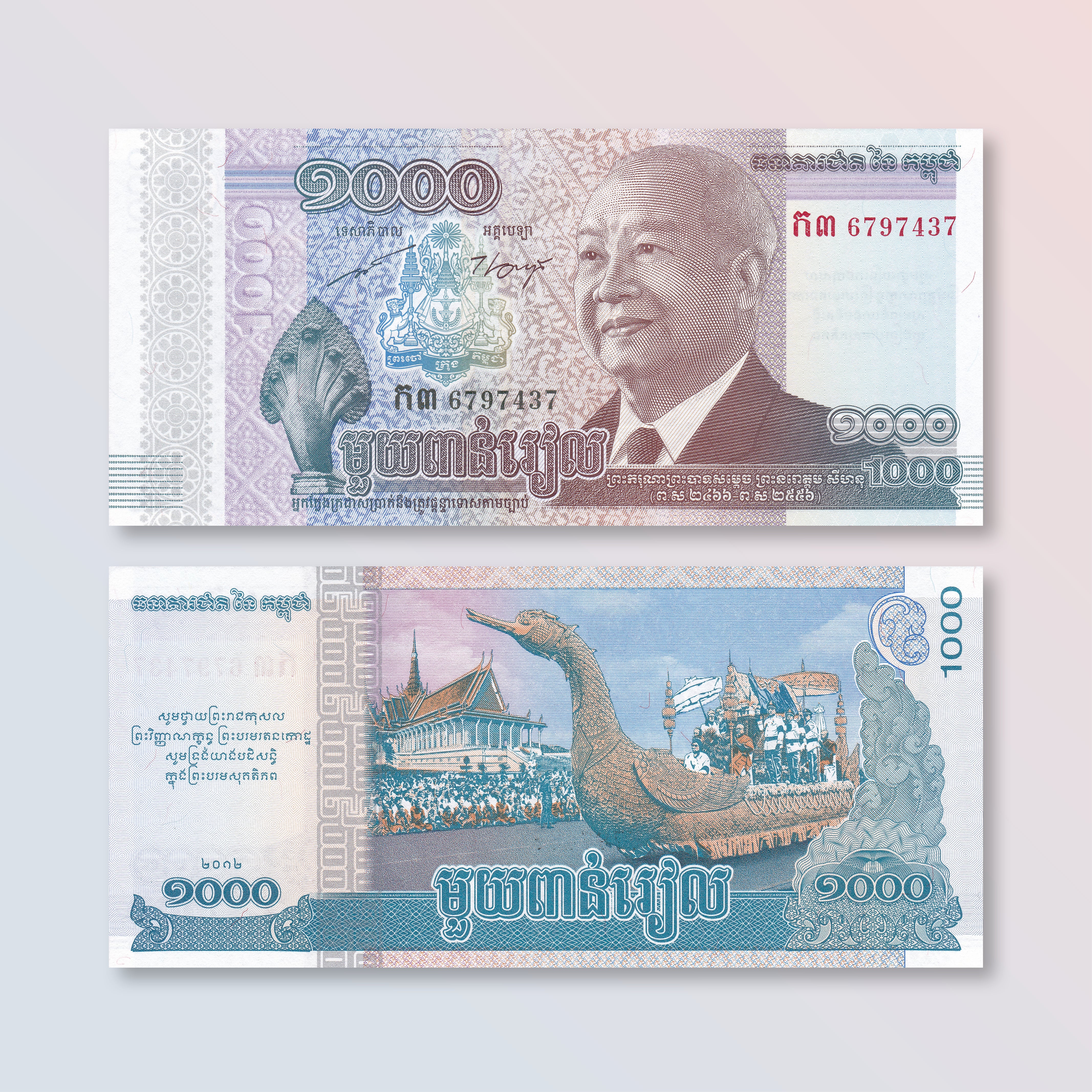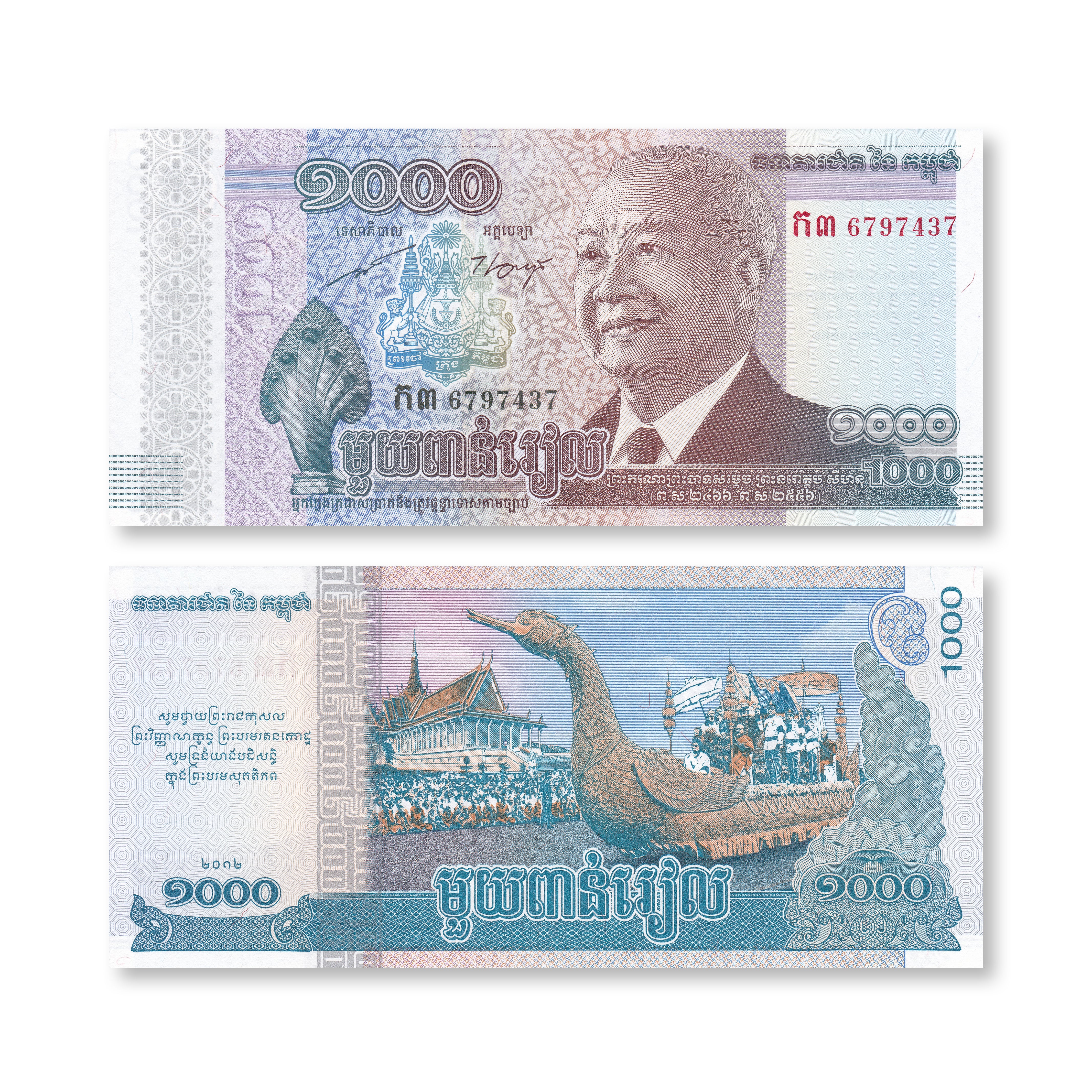 Front: King Norodom Sihanouk (1922–2012) known as "King Father," as a young man. Naga (mythical snake). Coat of arms.