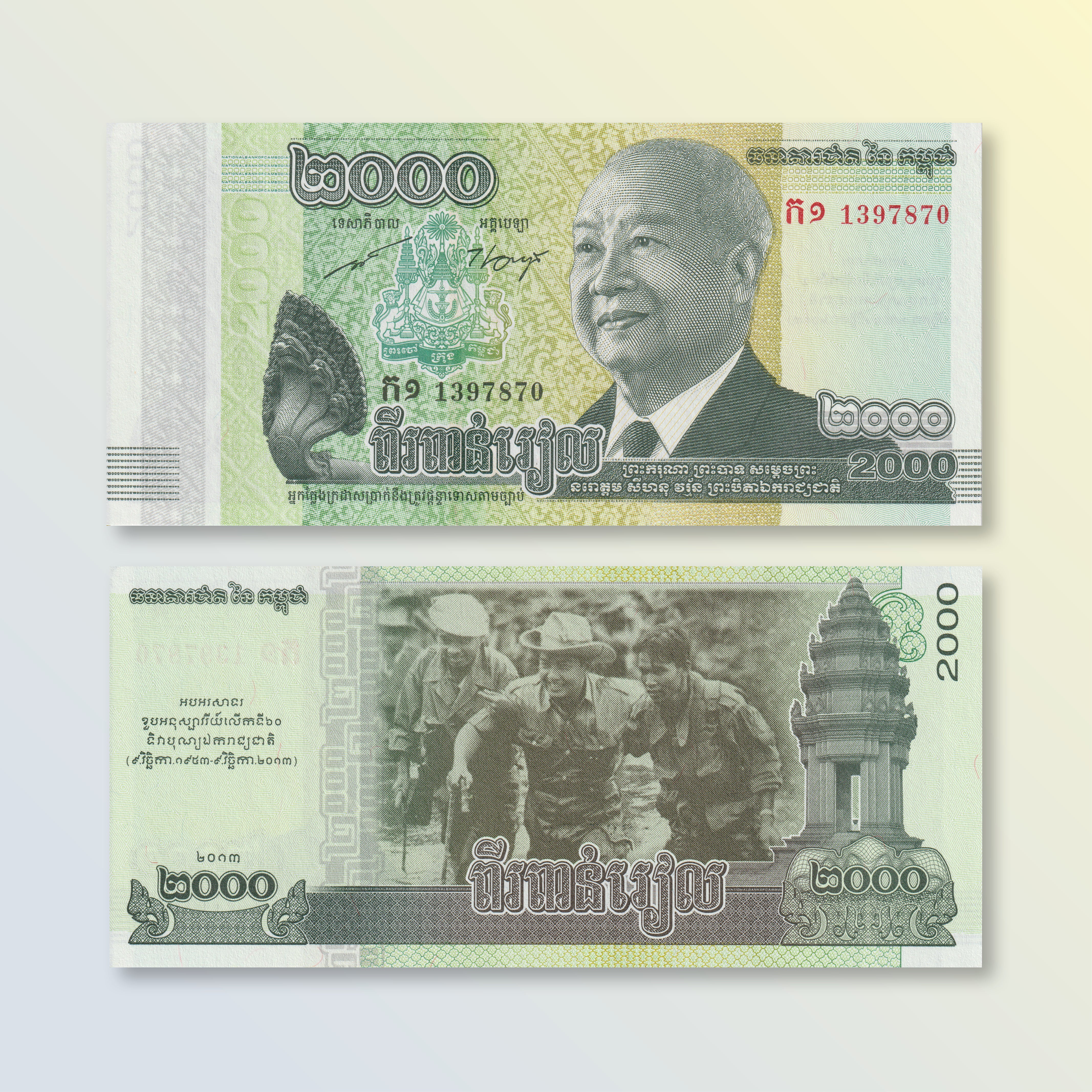 Front: King Norodom Sihanouk (1922–2012); Naga (mythical snake); coat of arms.