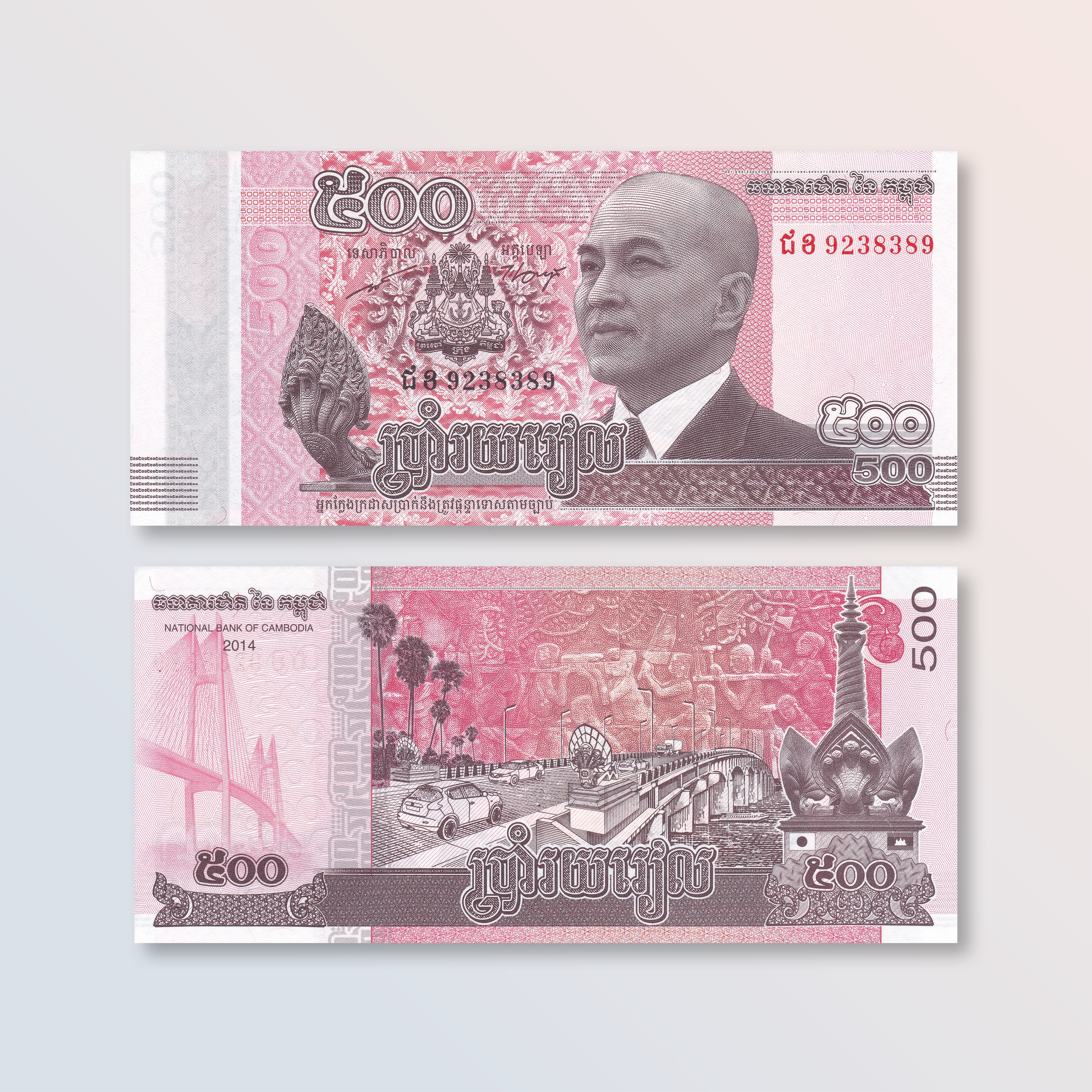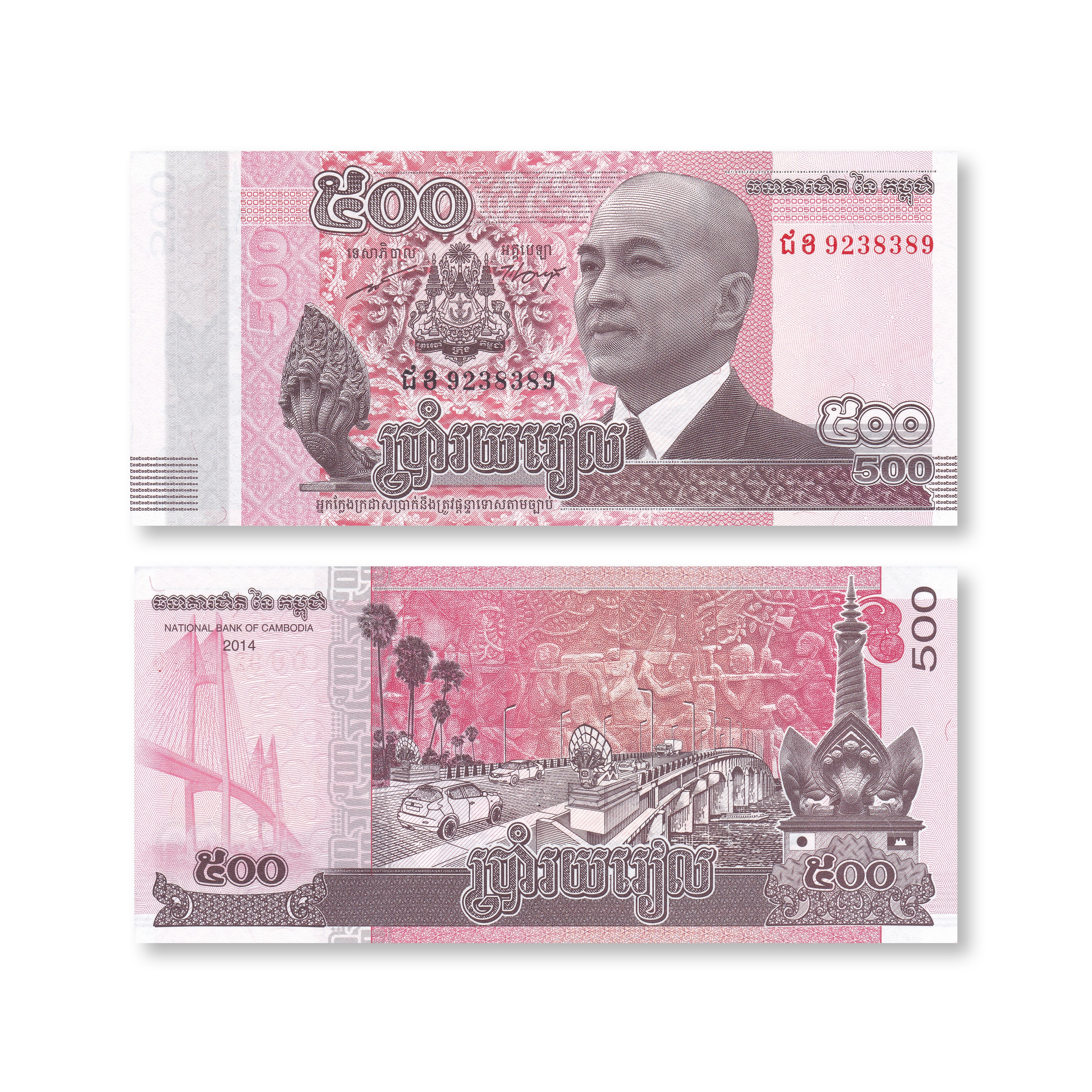 Front: King Norodom Sihamoni. Naga (mythical snake); coat of arms.