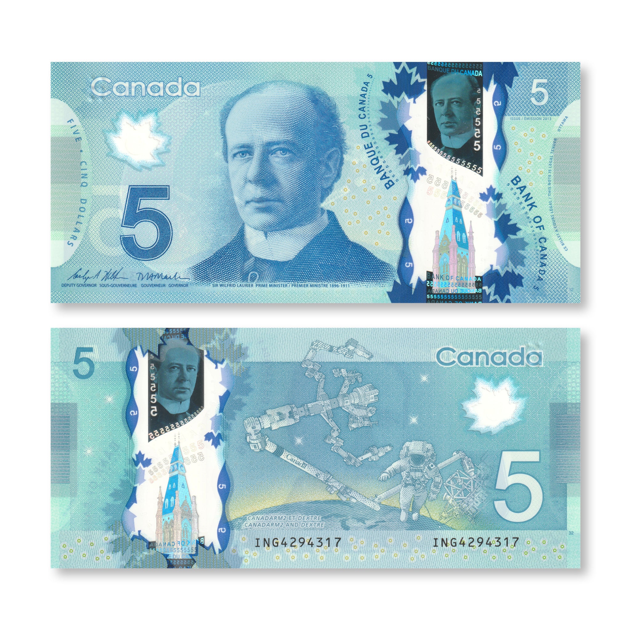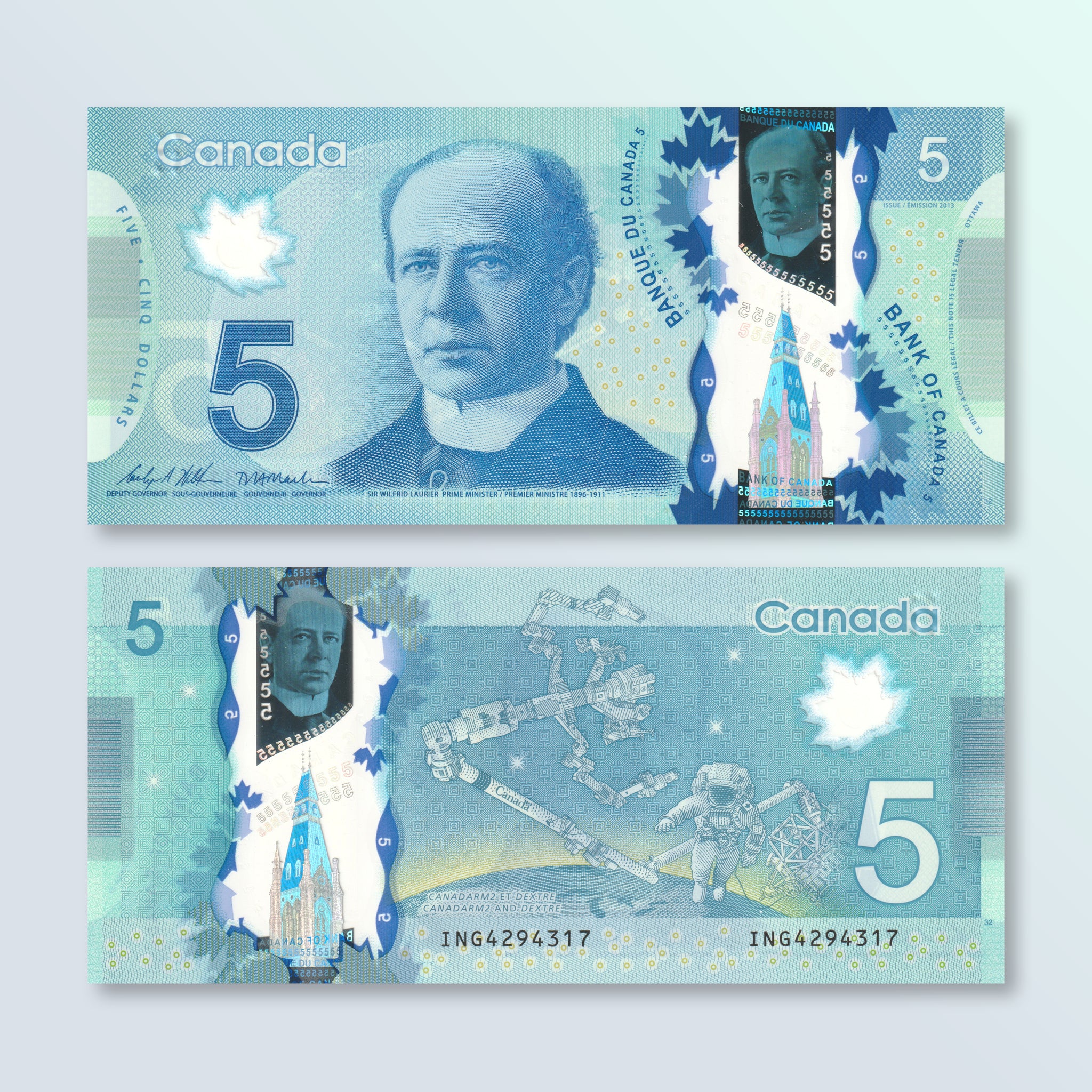 Front: Canada's seventh prime minister Wilfrid Laurier wearing a suit; maple leaf. CCL WinDOE holographic stripe with Wilfred Laurier and tower of the West Block of Parliament in Ottawa.