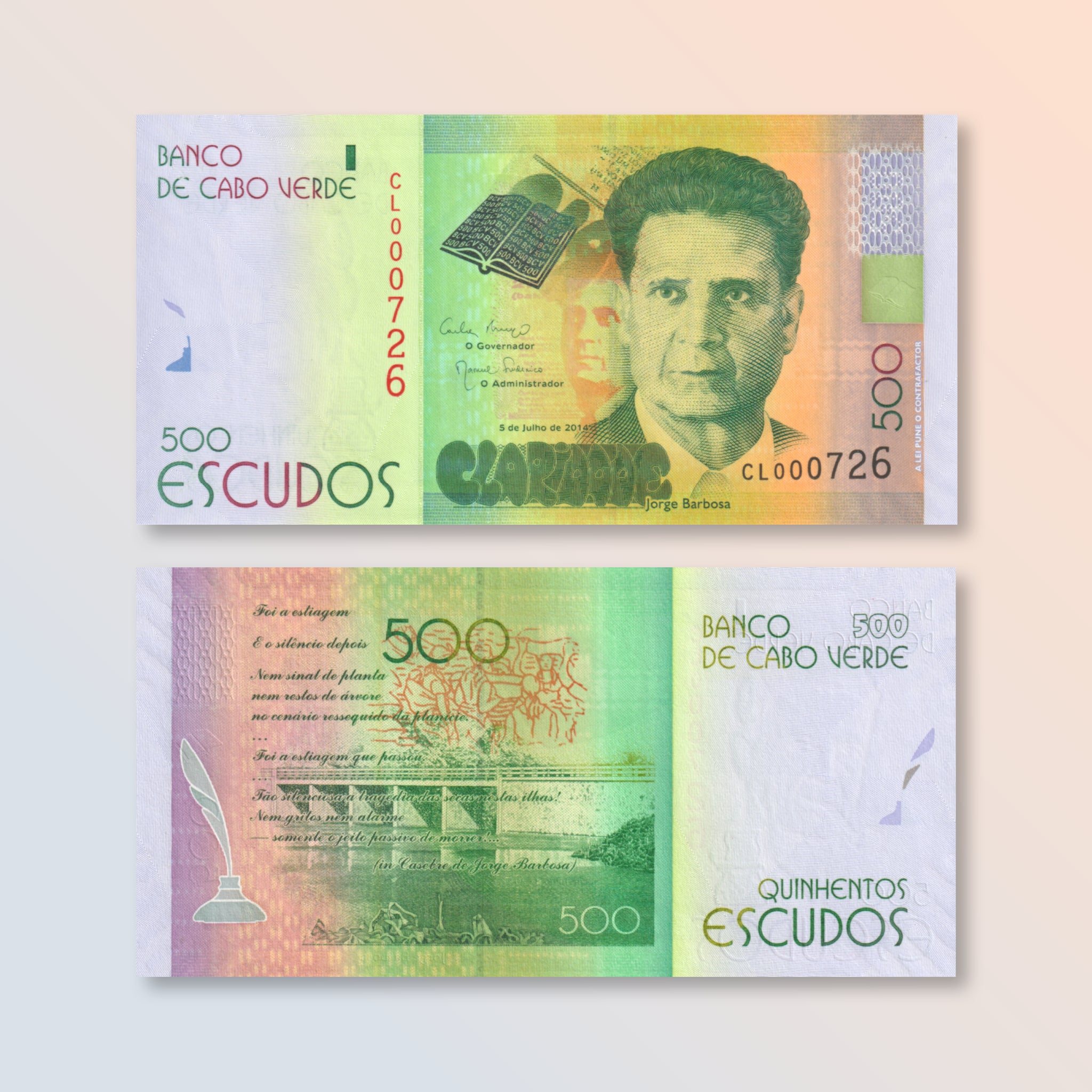 Back: Poilão Dam in the Santa Cruz municipal area on Santiago island (home of Jorge Barbosa); quill in inkwell; lines from Barbosa's poem ""Casebre"" (Struggle).