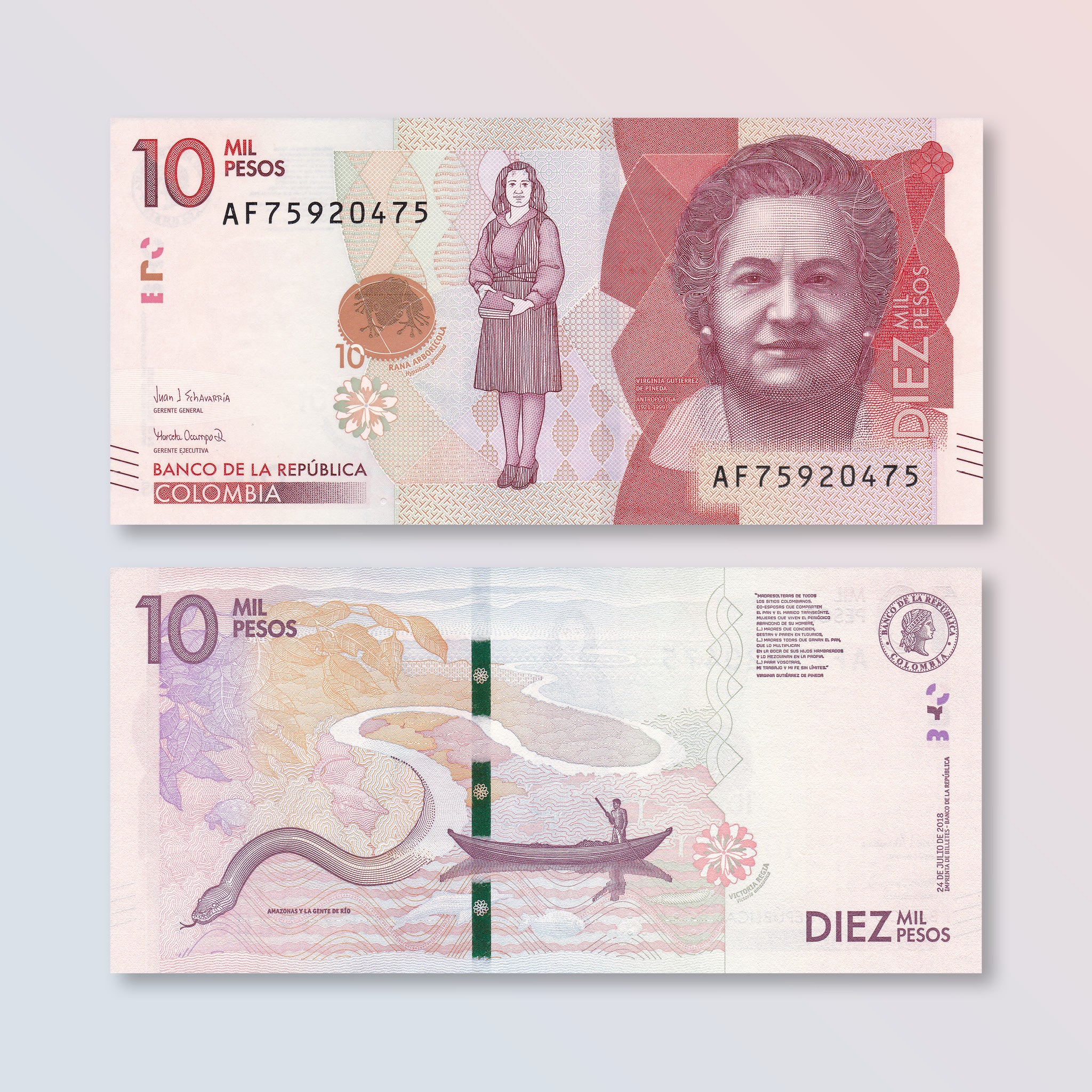 Back: Man holding a paddle in a canoe; Amazon river; leaves; snake; turtle; caiman; Victoria regia water lily flower; text from Gutierrez's book Familia y cultura en Colombia; Liberty head bank seal. Fuschia-to-green windowed security thread with demetalized BRC and flowers.