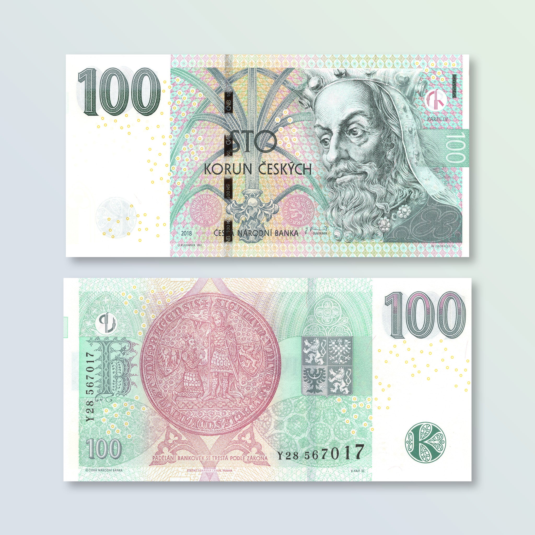 Back: Historic seal of Charls University on parchment strip; gothic windows from St. Vitus cathedral in Prague; coat of arms; stylized K in a circle.
