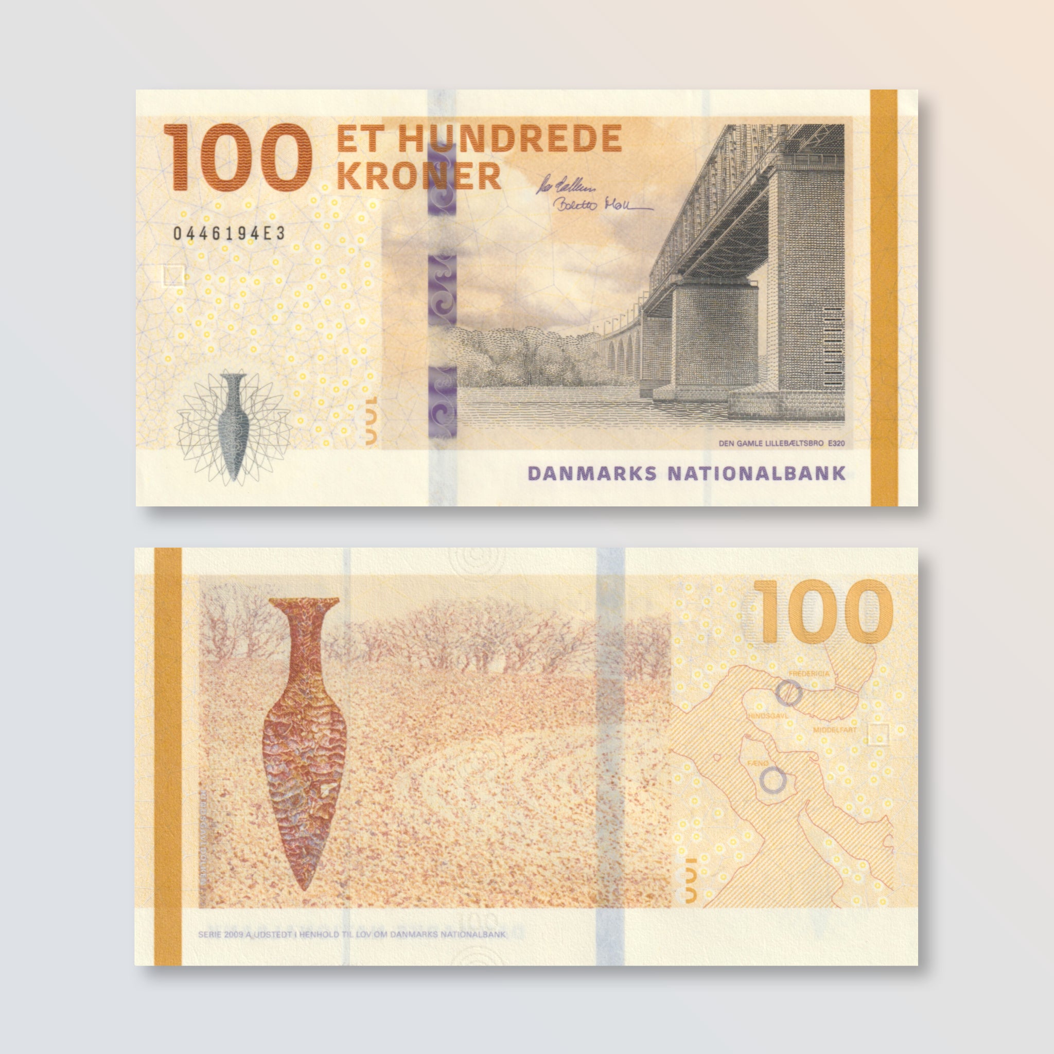 Front: Den Gamle Lillebæltsbro (Old Little Belt Bridge) linking Snoghøj in Jutland to Middelfart on Funen; Hindsgavl dagger holographic patch.