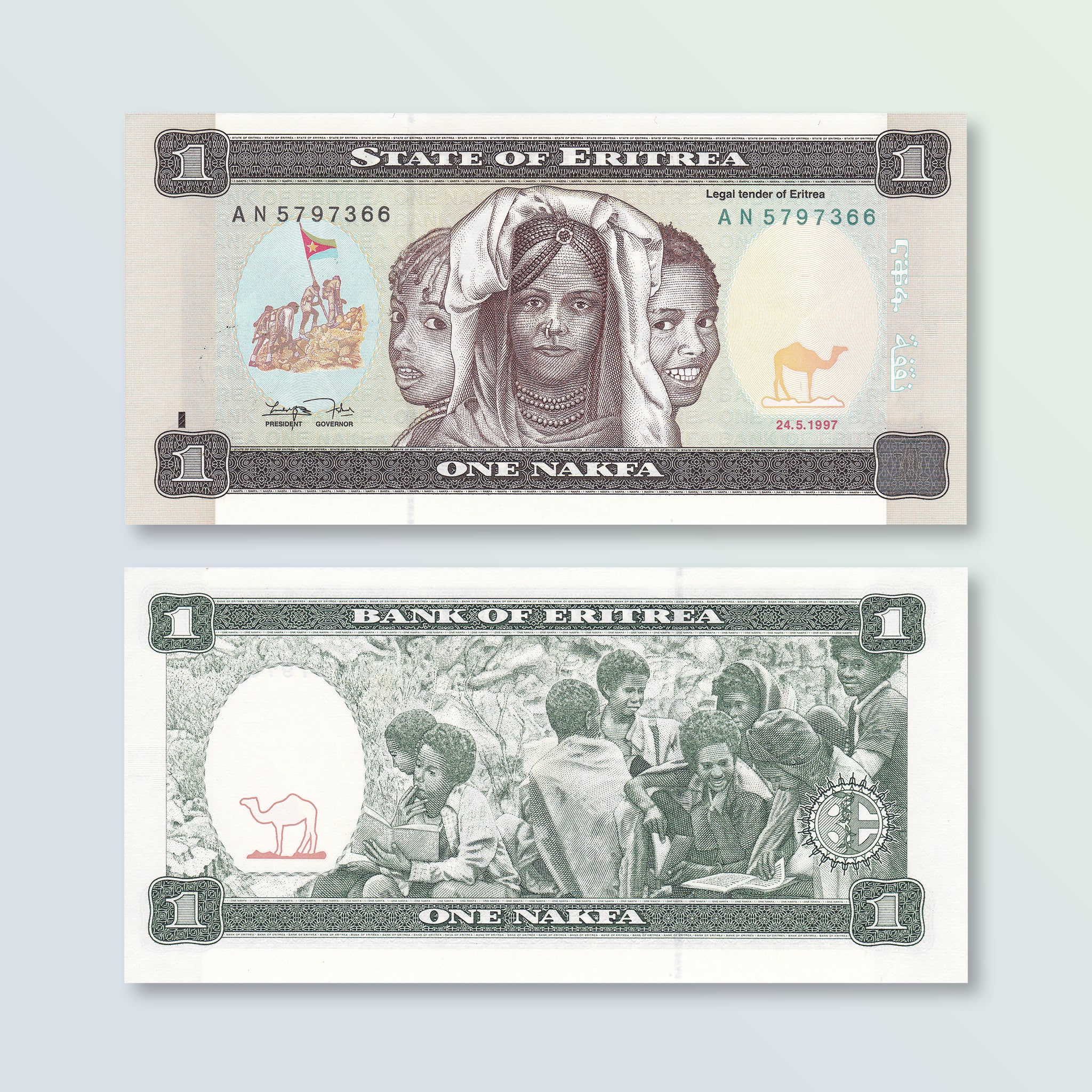 Back: Students outside studying and conversing, camel, Bank of Eritrea logo.