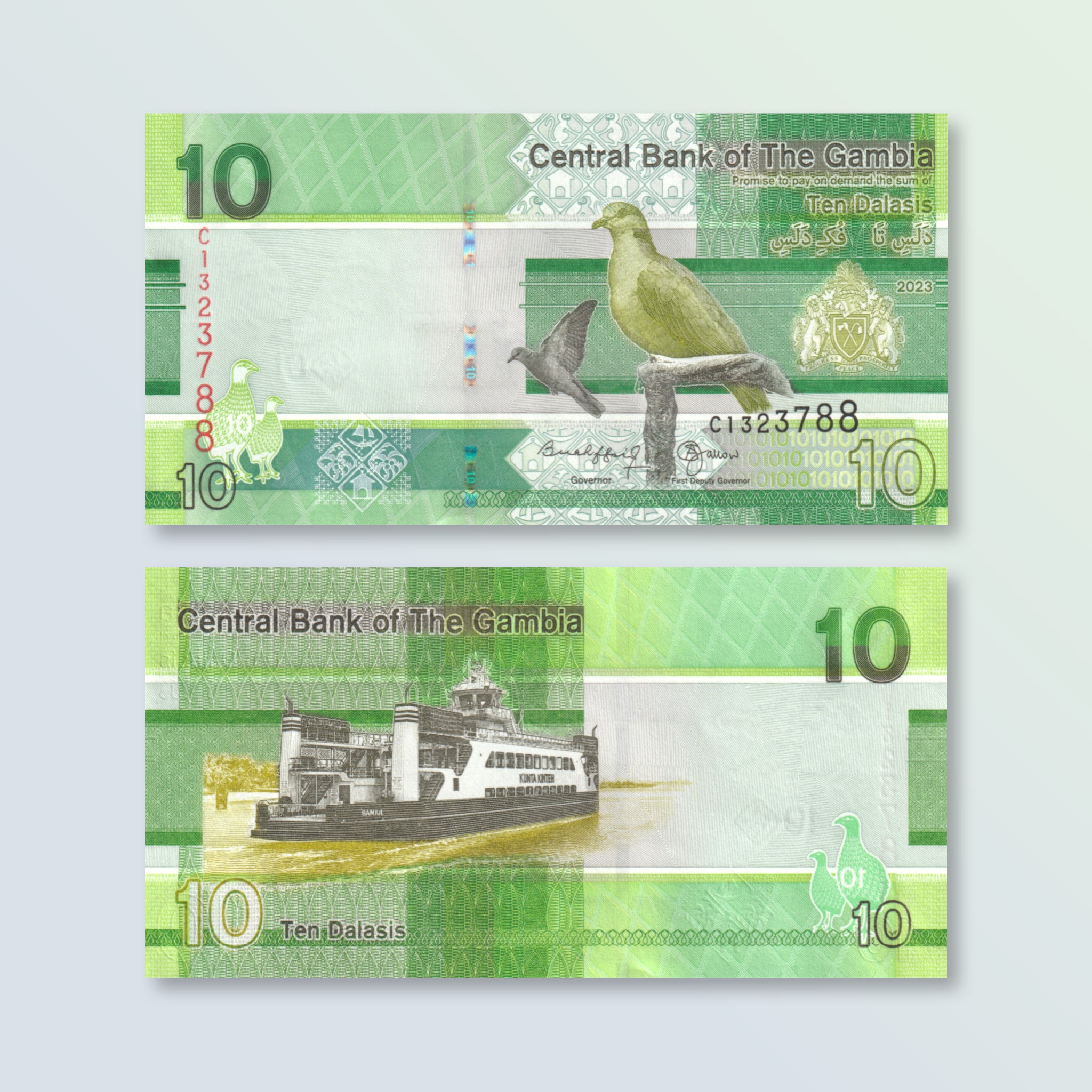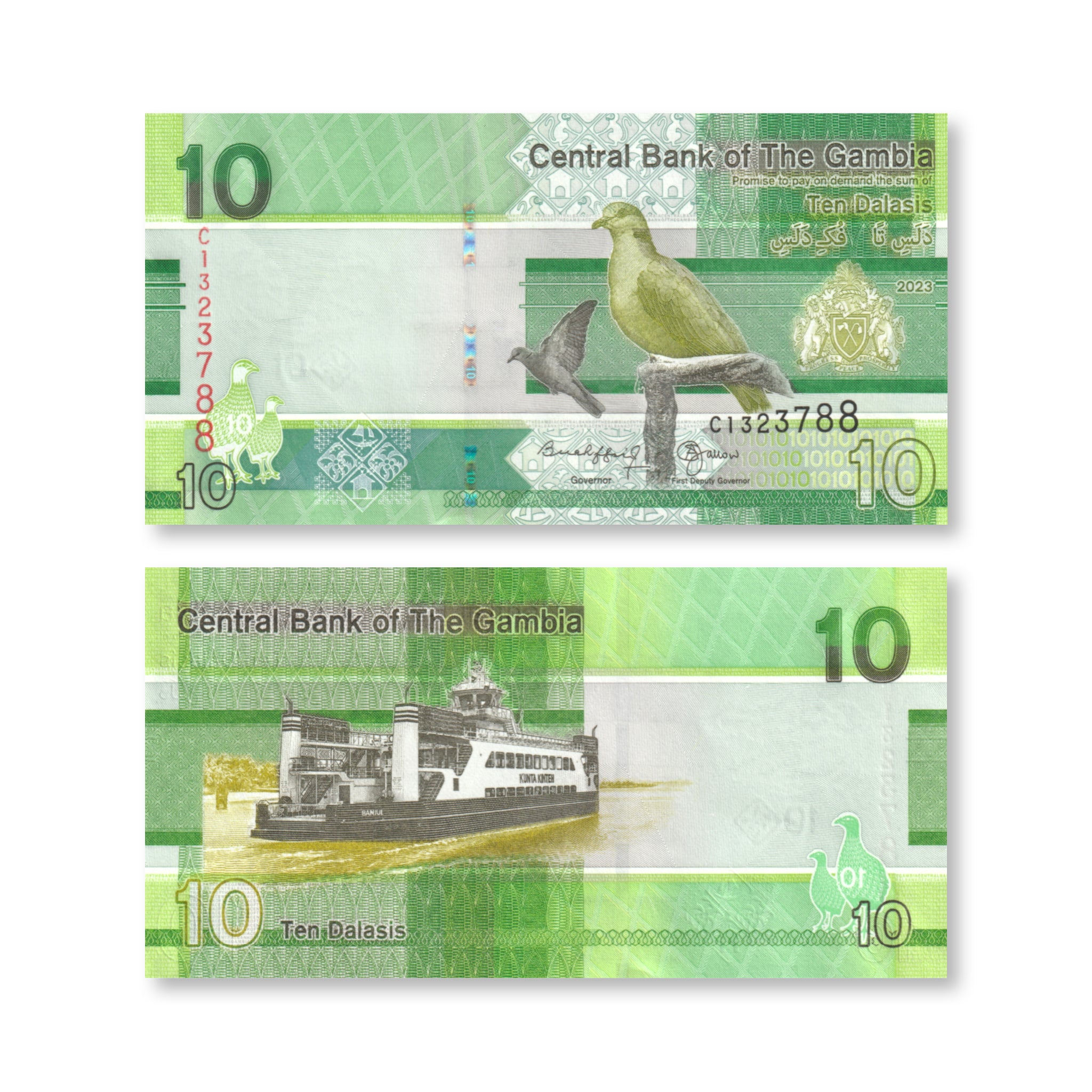 Back: Kunta Kinteh ferry; two standing bush fowl birds. Pearlescent stripe on back with 10.