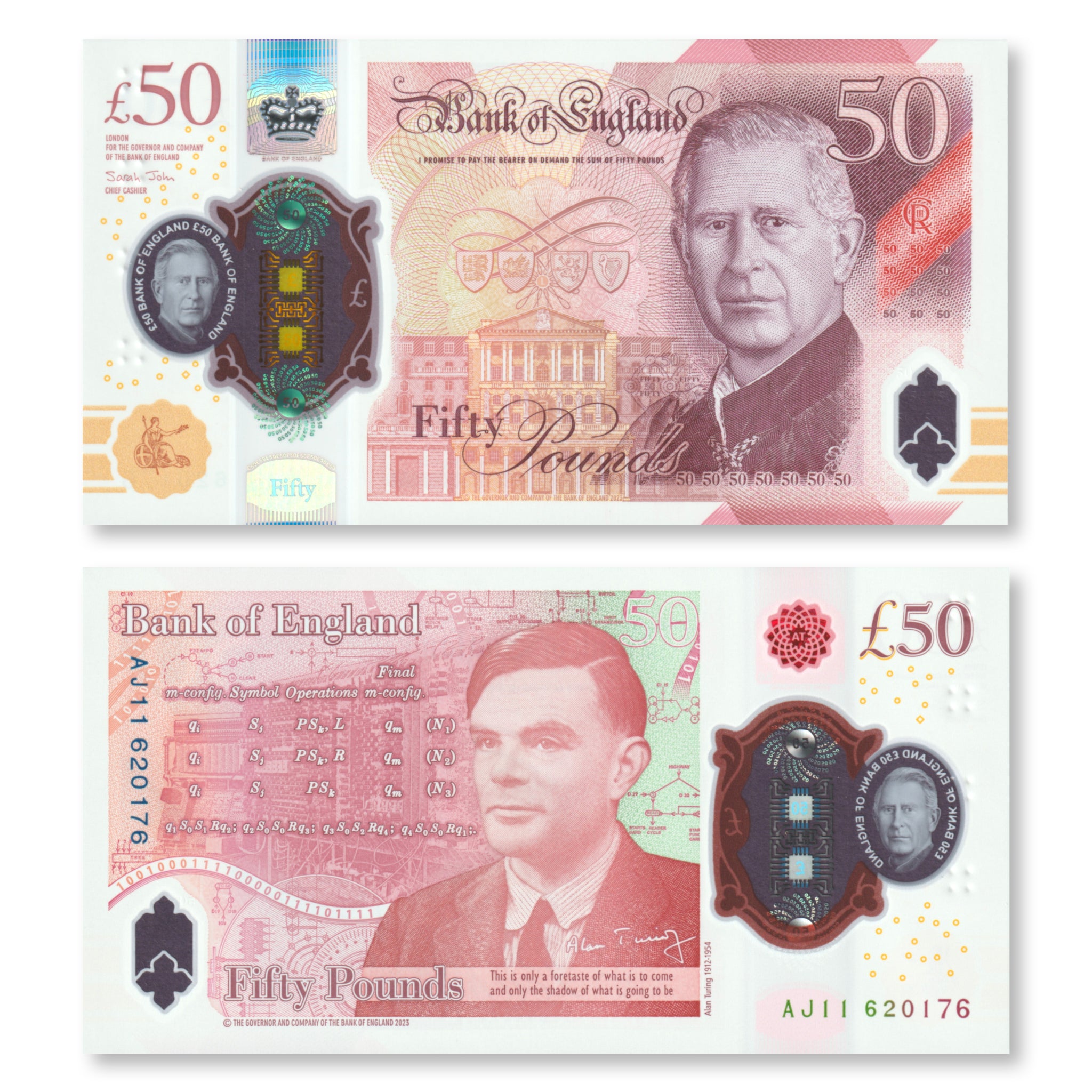 Front:  Portrait of King Charles III; Bank of England seal; computer chip circuitry; coronation crown; Bank of England headquarters building, London; coats of arms.