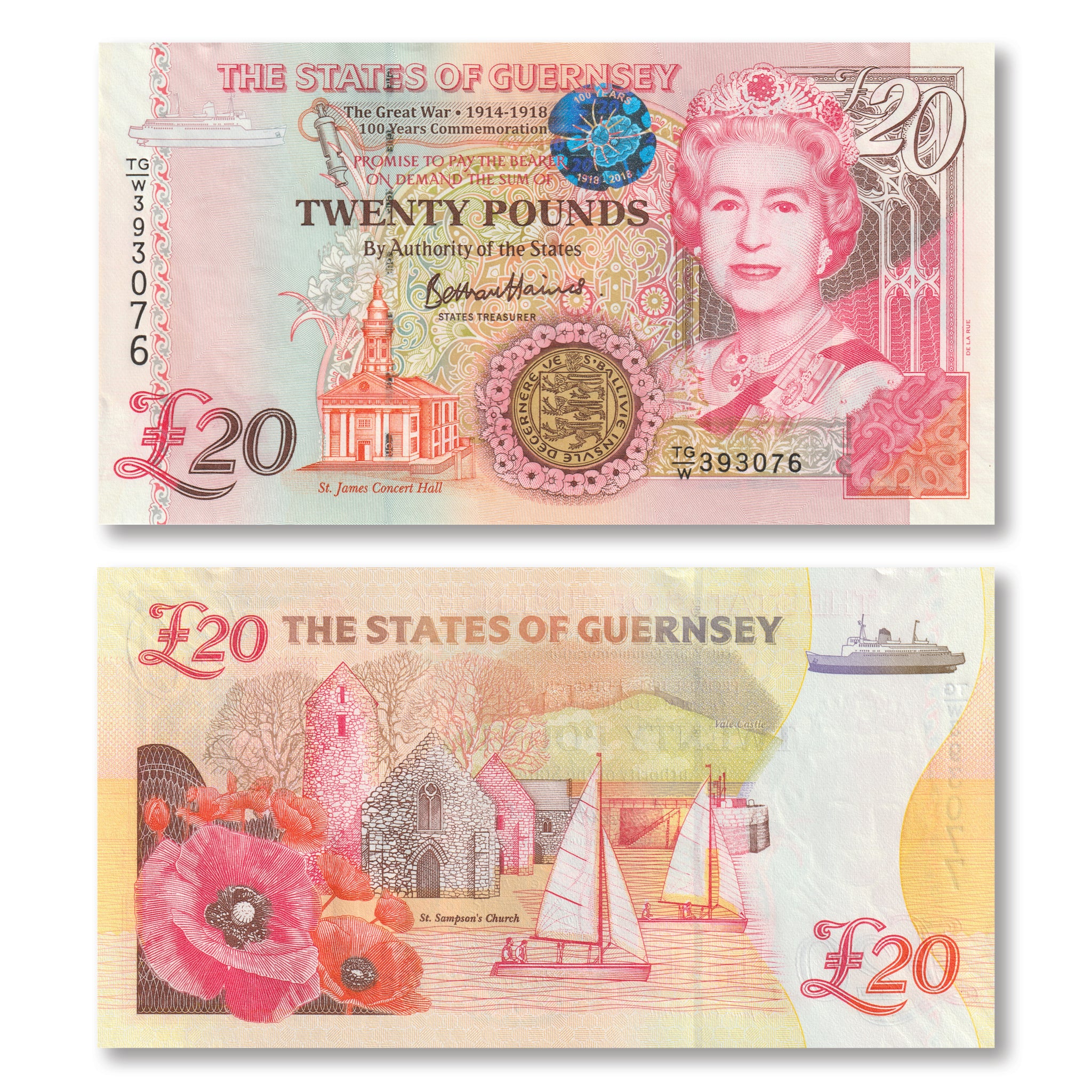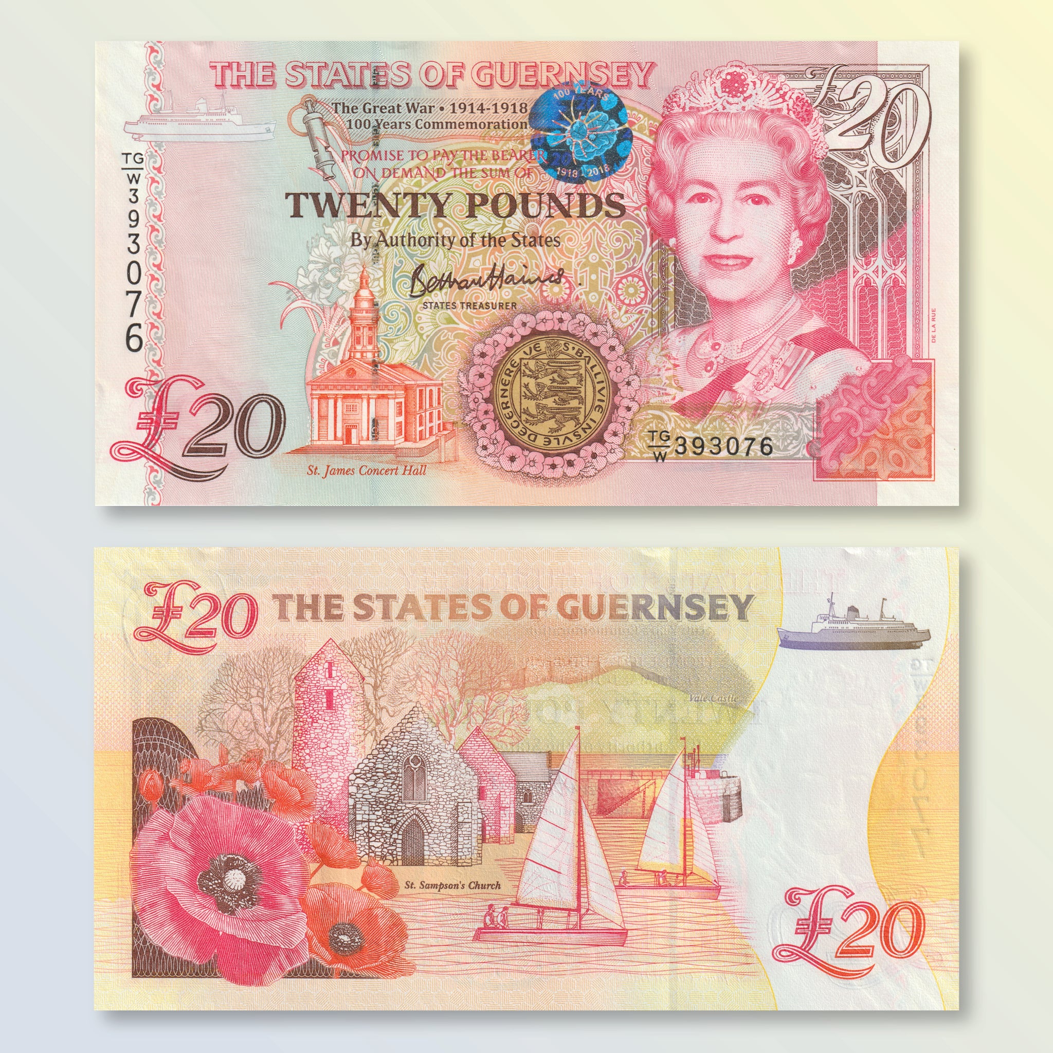 Front: Foil poppy flower and the text The Great War 1914–1918 100 Years Commemorative. Portrait of Queen Elizabeth II; ferry ship as registration device; Guernsey lily; Saint James Concert Hall in Saint Peter Port; poppy flowers surrounding Bailiwick seal.