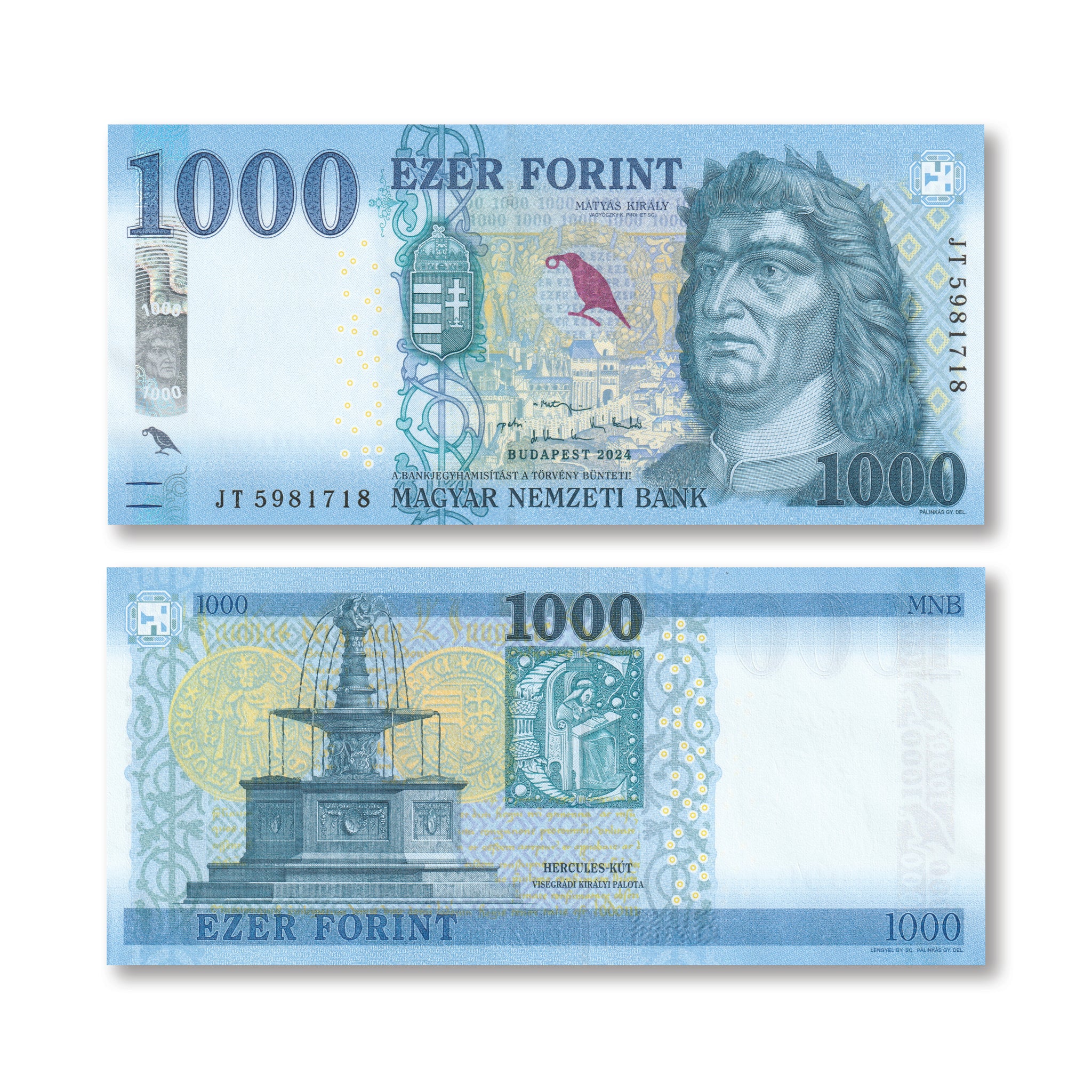 Front: Portrait of King Matthias Corvinas; crowned coat of arms; raven in purple-to-green OVI; wreath with crowned coat of arms.