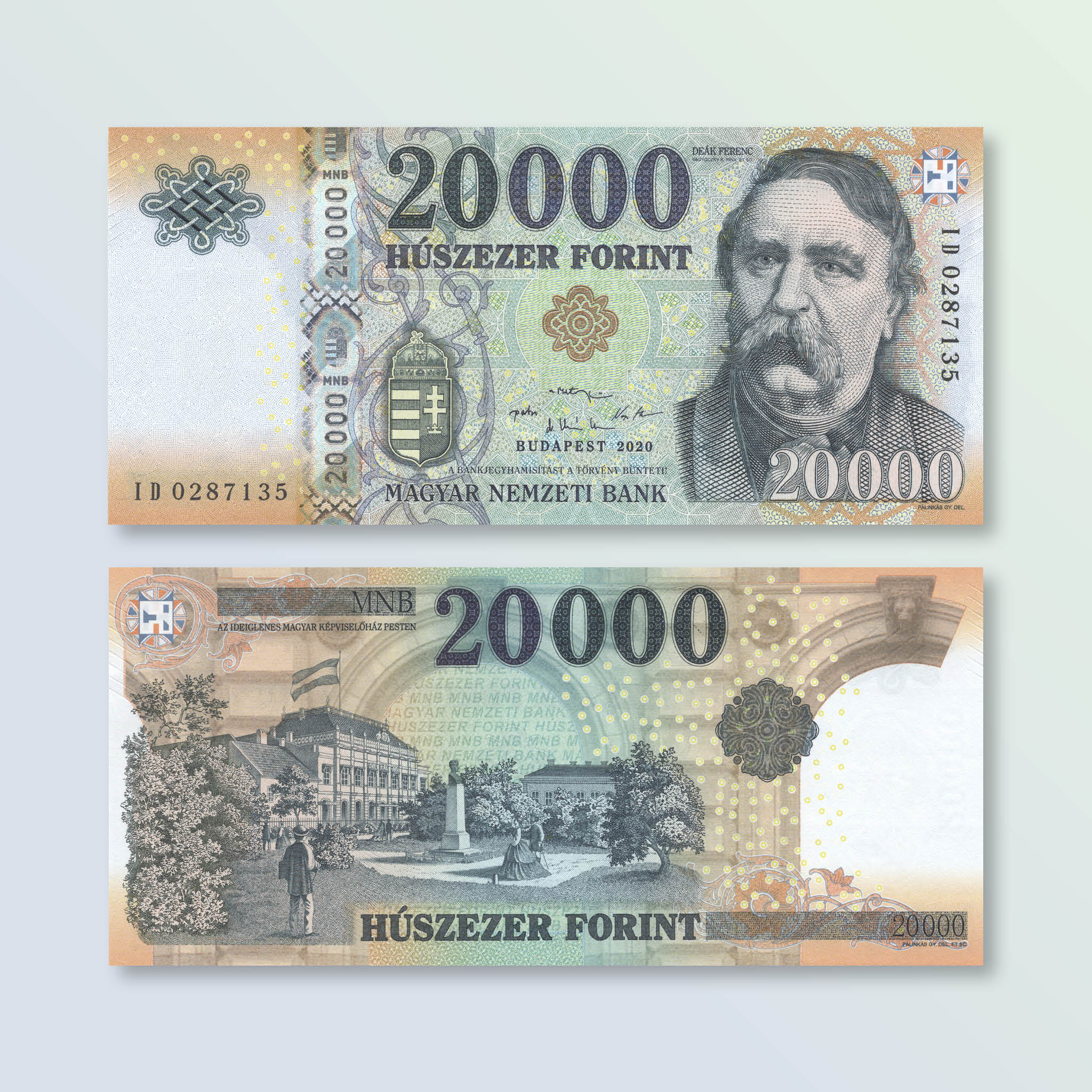 Front: Portrait of former Minister of Justice Ferenc Deák de Kehida (1803–1976); gold-to-green OVI ornament; coat of arms.
