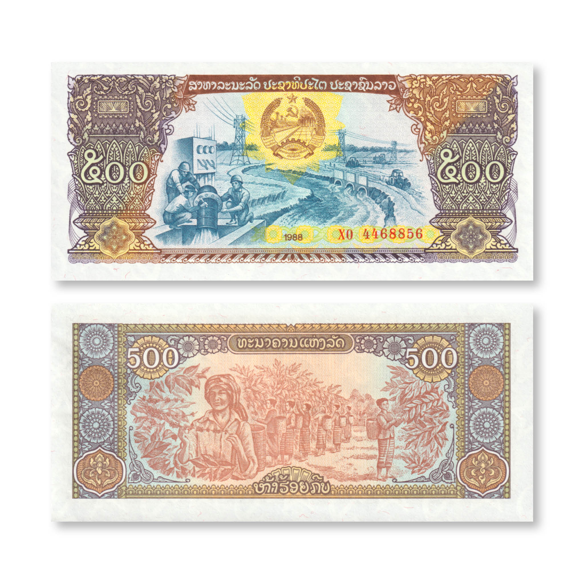 Front:  Workers adjusting an irrigation pipe; electrical power towers; tractors; Laotian coat of arms.