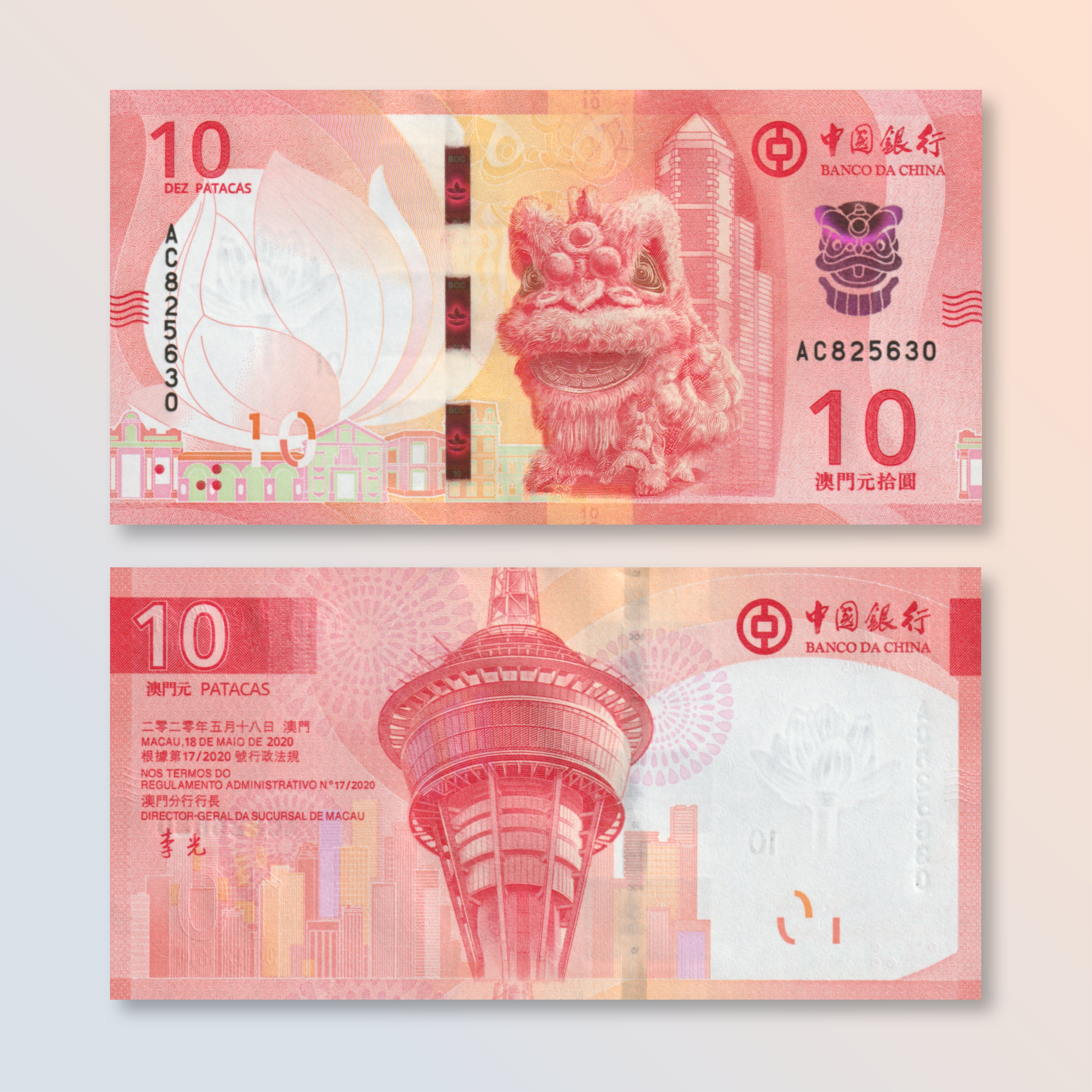 Front:  Dragon; Banco da China headquarters building in Macau; lotus flower; bank logo; streetscape with building facades; dragon head in OVI. Windowed security thread with demetalized BOV / 10.