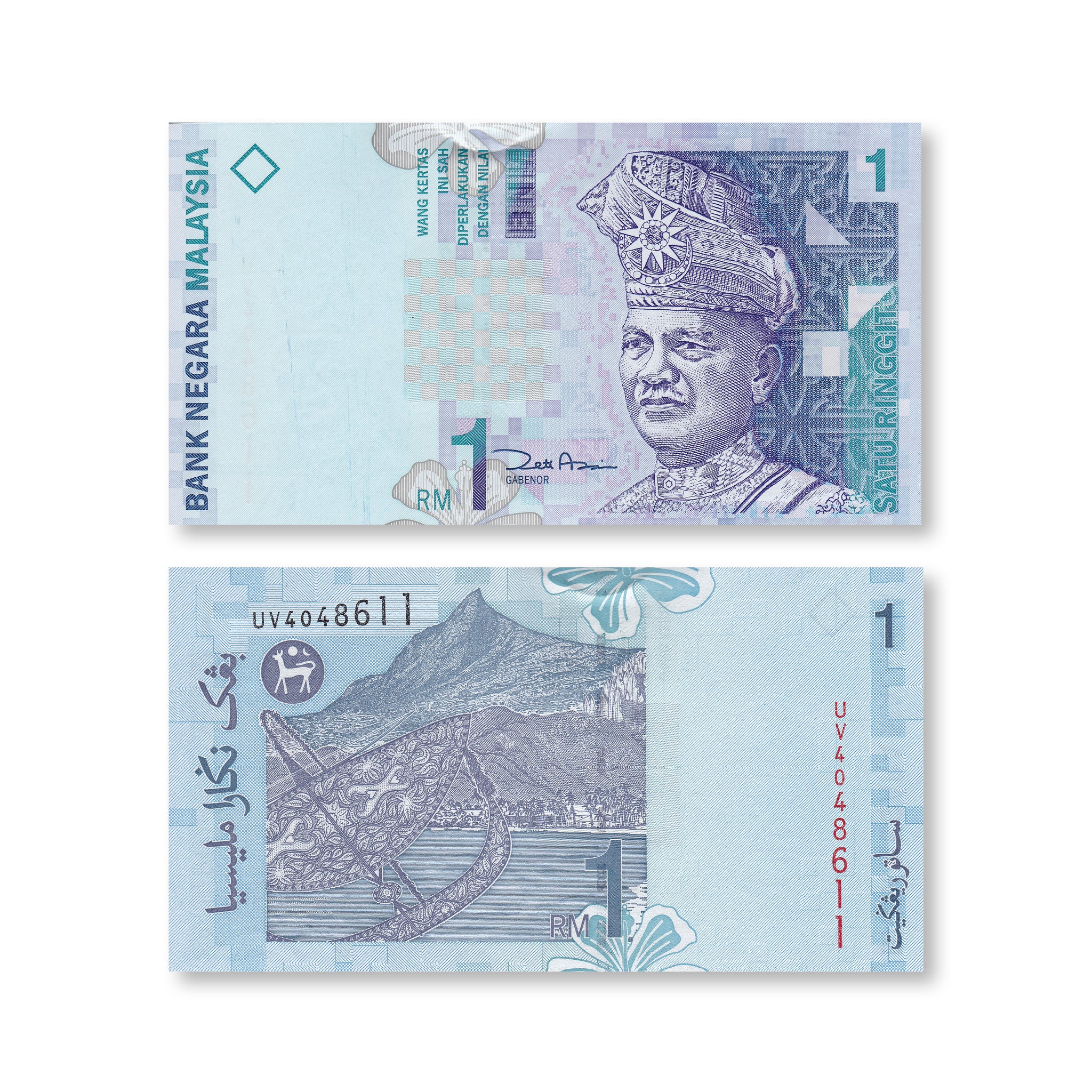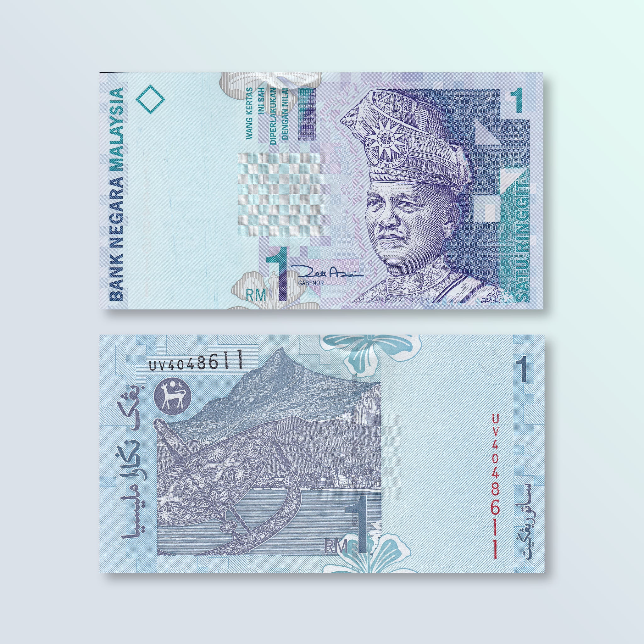 Back: Mount Kinabalu and pinnacles of Gunung Api in Mulu National Parl; beach; Malaysian kite; BNM logo.