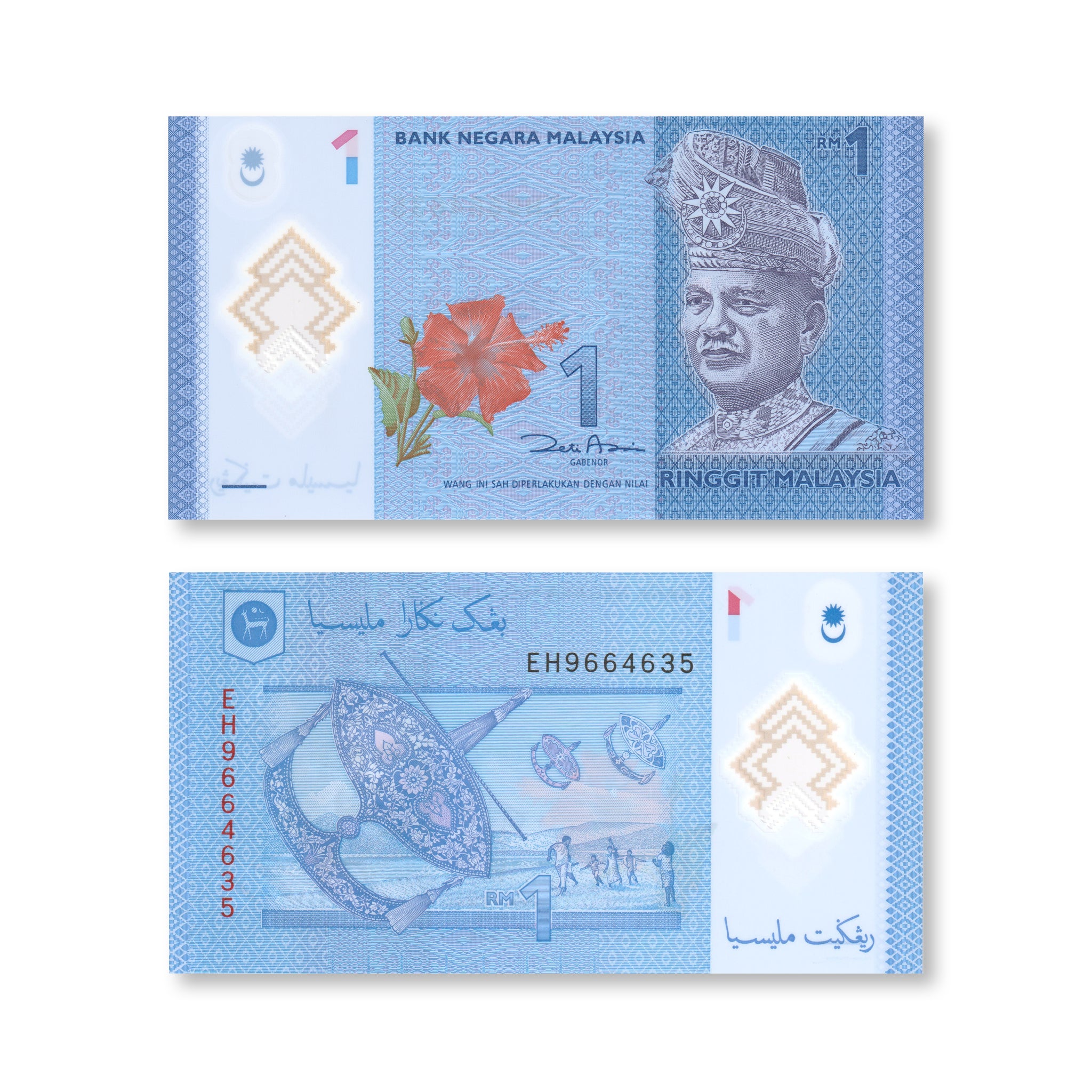 Front: Portrait of former prime minister Tuanku Abdul Rahman (1895-1960) wearing tengkolok headgear; bunga raya (hibiscus) flower; songket (traditional woven fabric) patterns. Text on front "Ringgit Malaysia" is filled in solid.