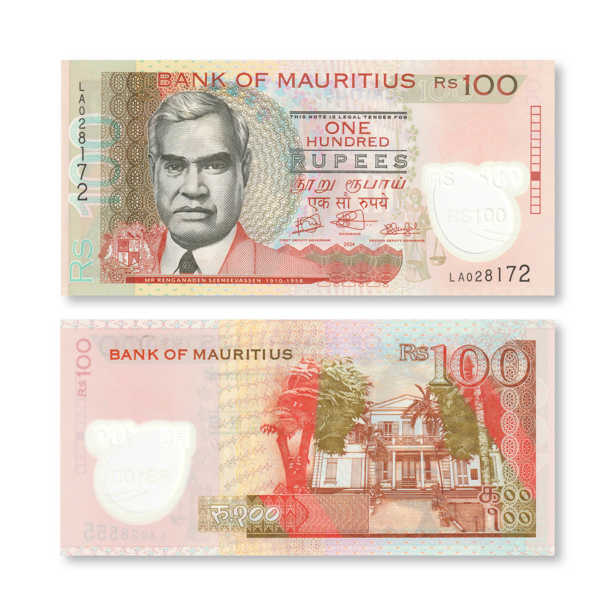 Front: Portrait of politician and cabinet minister Renganaden Seeneevassen; bank building facade; standing Justice with sword and scales; dodo bird head; blue-to-gold Swing dodo egg.