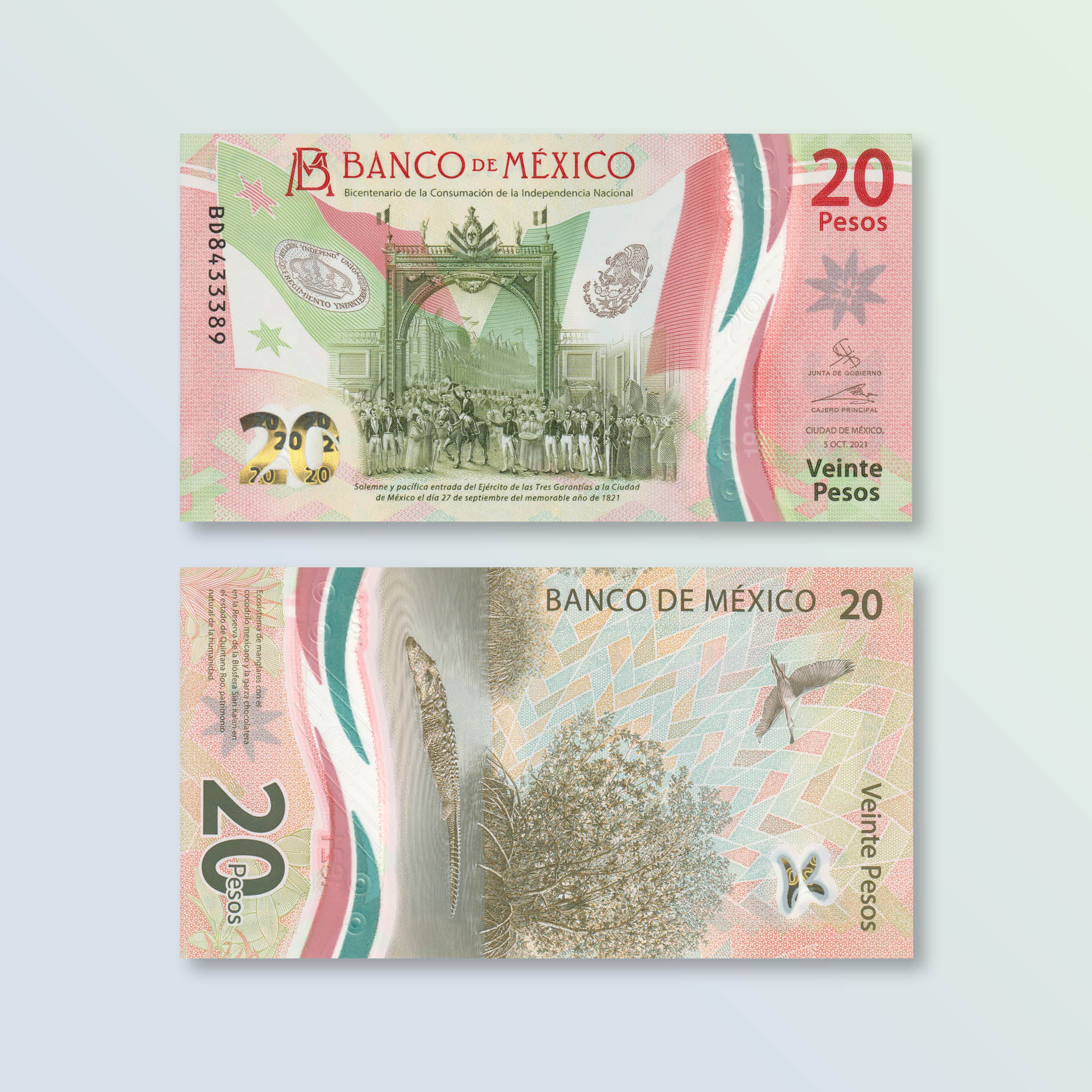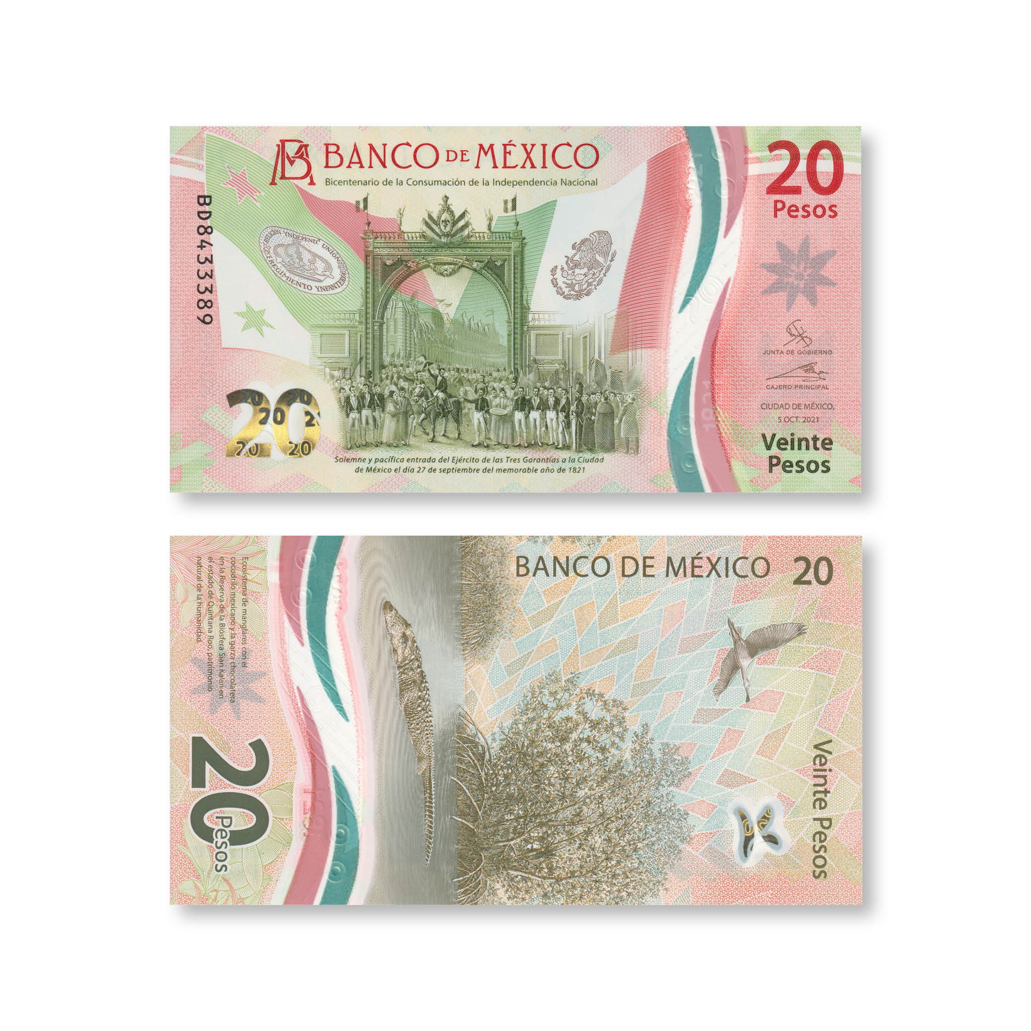 Front: Flags flanking an archway with crowd, taken from the anonymous painting Solemne y pacífica entrada del Ejército de las Tres Garantías a la Ciudad de México el día 27 de setiembre del memorable año de 1821 (Solemn and peaceful entrance of the Army of the Three Guarantees to Mexico City on September 27th of the memorable year 1821). This painting is a part of the collection of the National Museum of History, Chapultepec Castle in Mexico City. Bank monogram.
