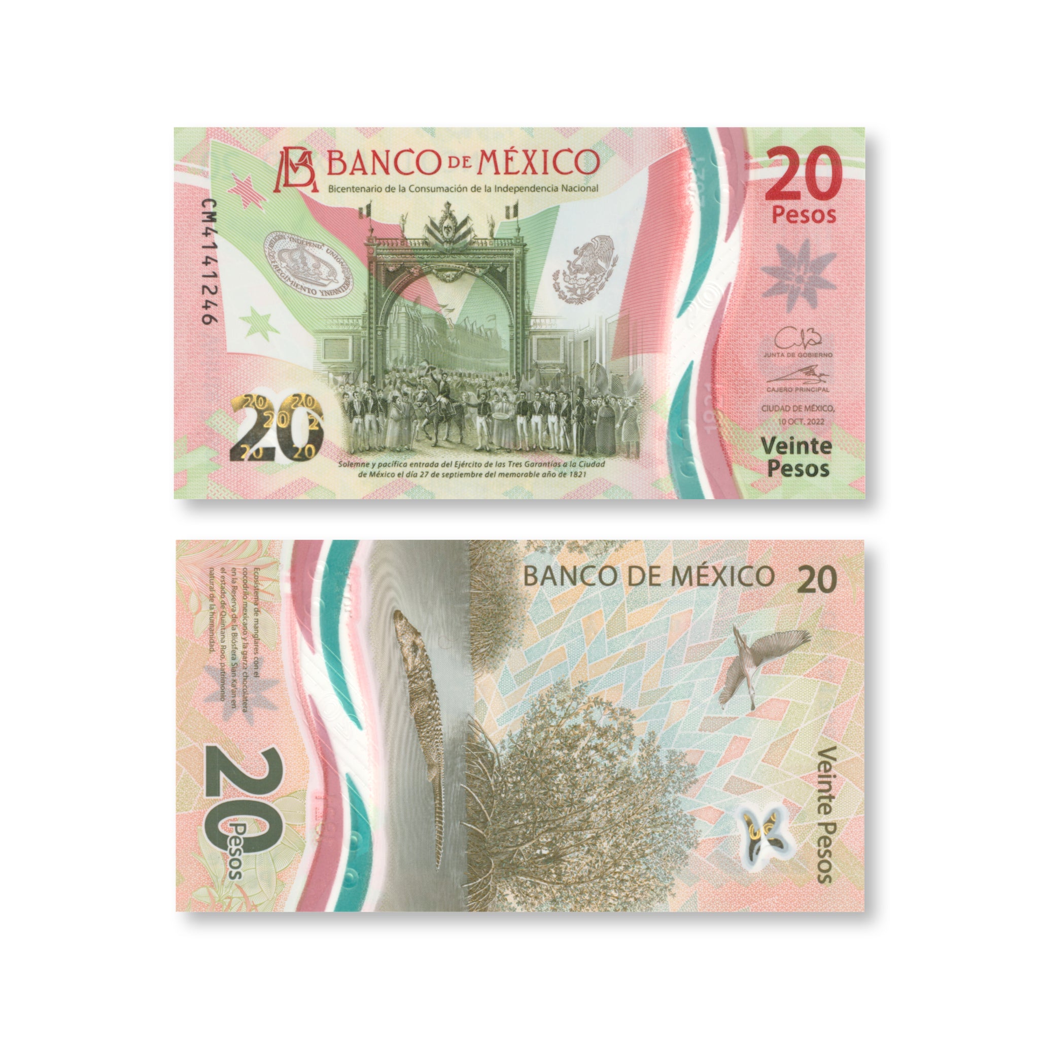 Front: Flags flanking an archway with crowd, taken from the anonymous painting Solemne y pacífica entrada del Ejército de las Tres Garantías a la Ciudad de México el día 27 de setiembre del memorable año de 1821 (Solemn and peaceful entrance of the Army of the Three Guarantees to Mexico City on September 27th of the memorable year 1821). This painting is a part of the collection of the National Museum of History, Chapultepec Castle in Mexico City. Bank monogram.