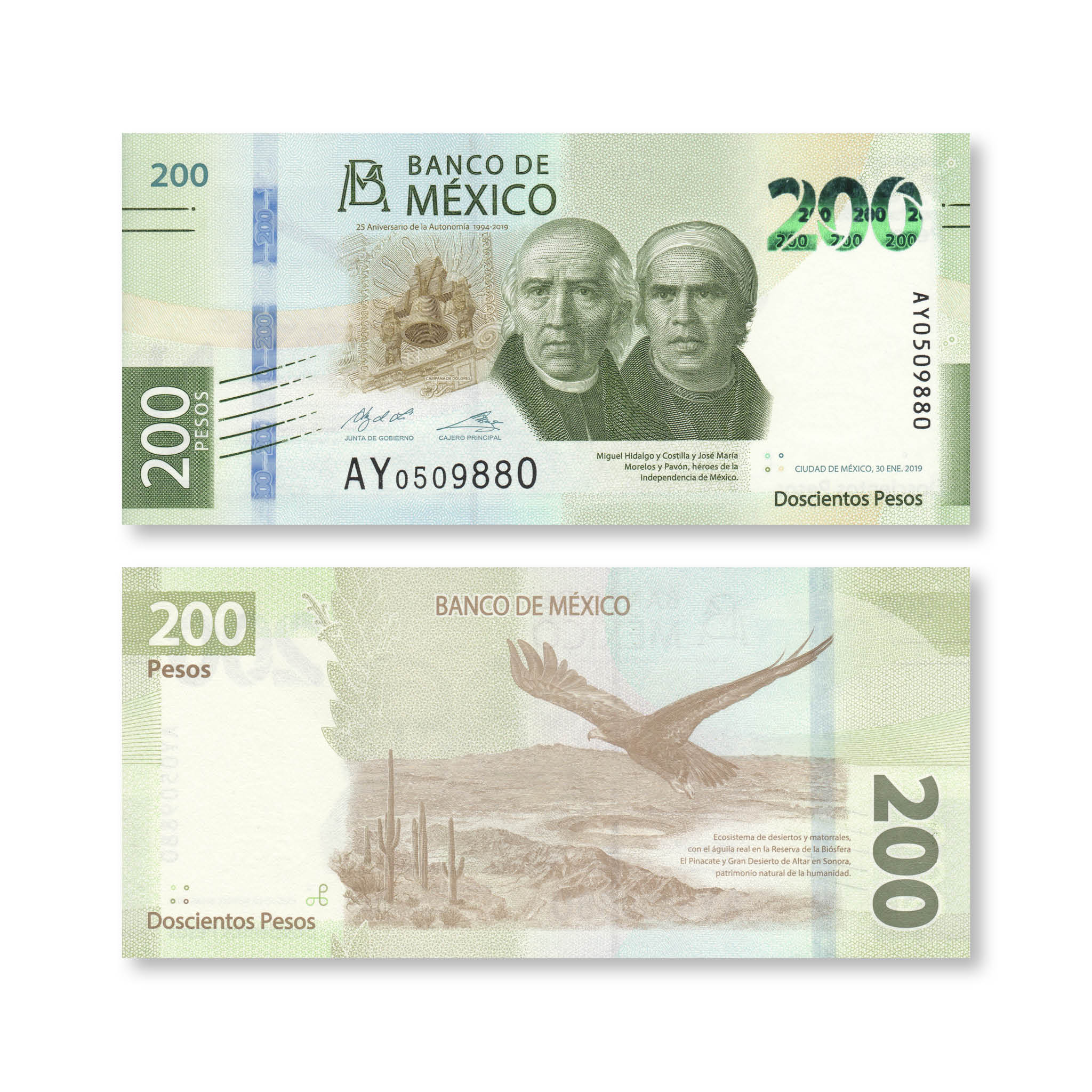 Front: Portraits of revolutionaries Miguel Hidalgo and José María Morelos, who led the Mexican War of Independence from Spain in the early 19th century. Bank monogram; denomination in green SPARK Live.