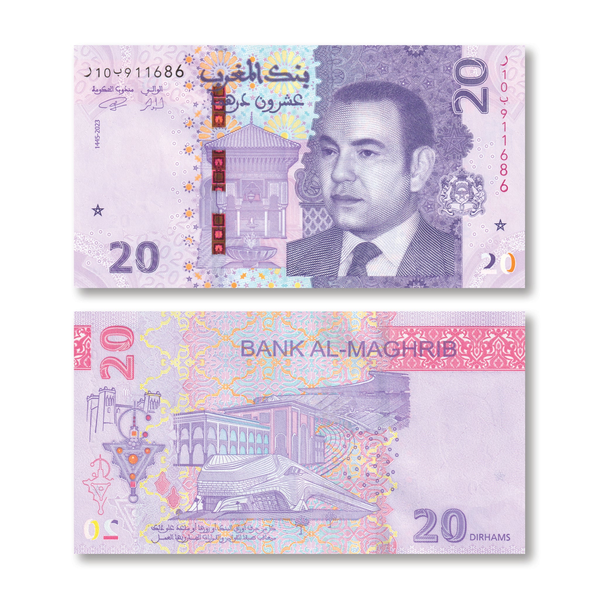 Front: Portrait of King Mohamed VI; stylized view of the University Al Quaraouiyine in Fes; architectural design inspired by Moroccan doors; Moroccan coat of arms; denomination as registration device; one five-pointed star.