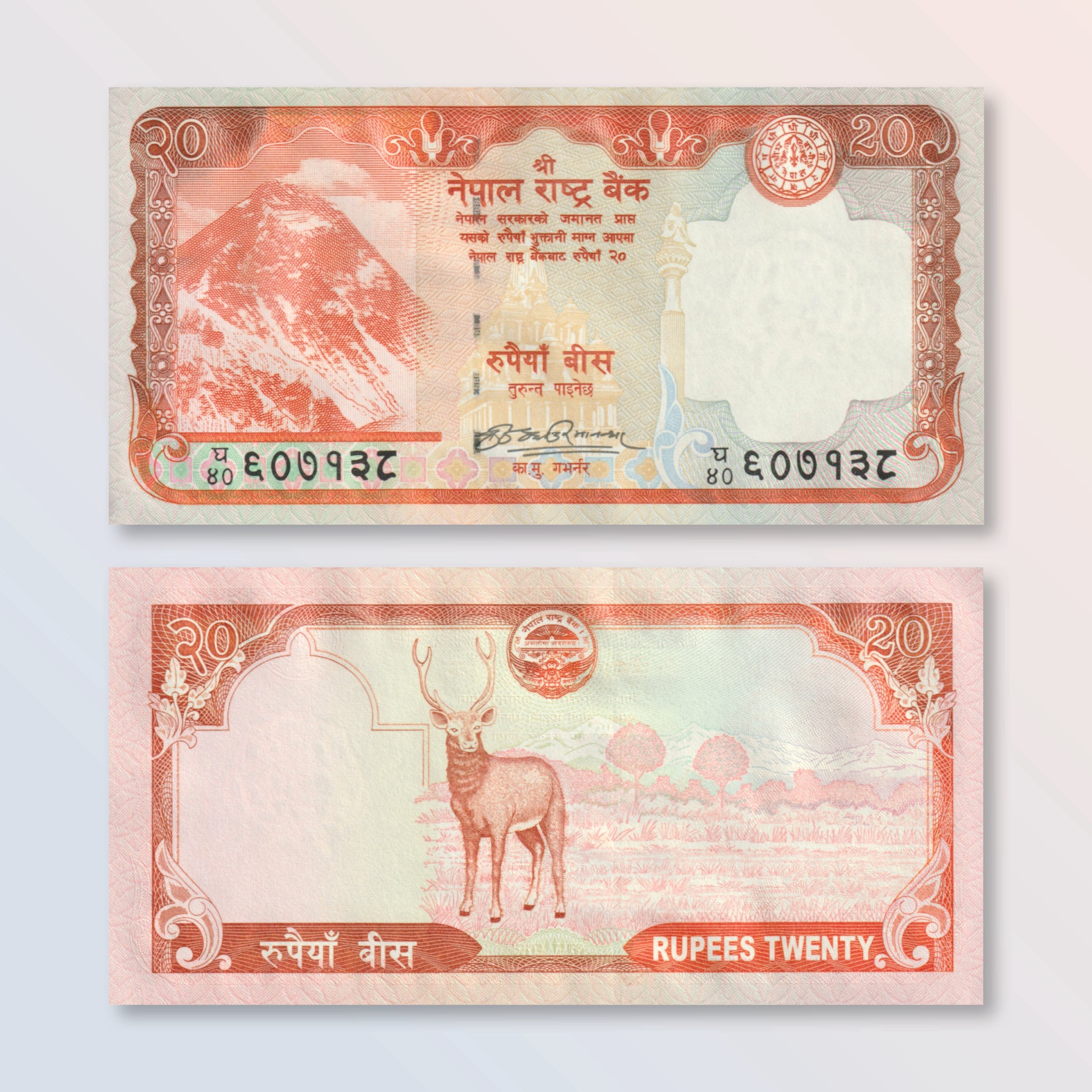 Front: Mount Everest; temple of god Krishna of Patan; Garuda atop pillar; obverse of a coin.