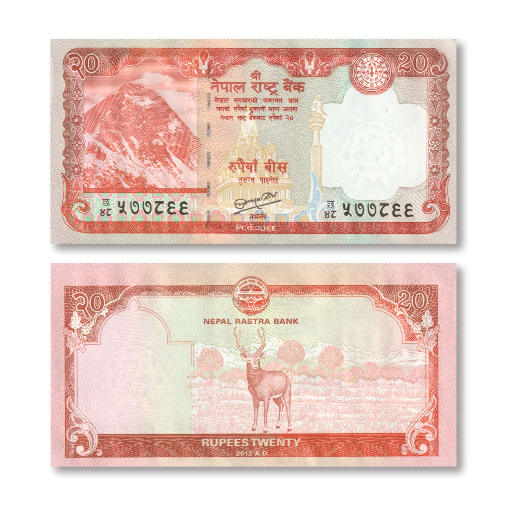 Front: Mount Everest; temple of god Krishna of Patan; Garuda atop pillar; obverse of a coin.