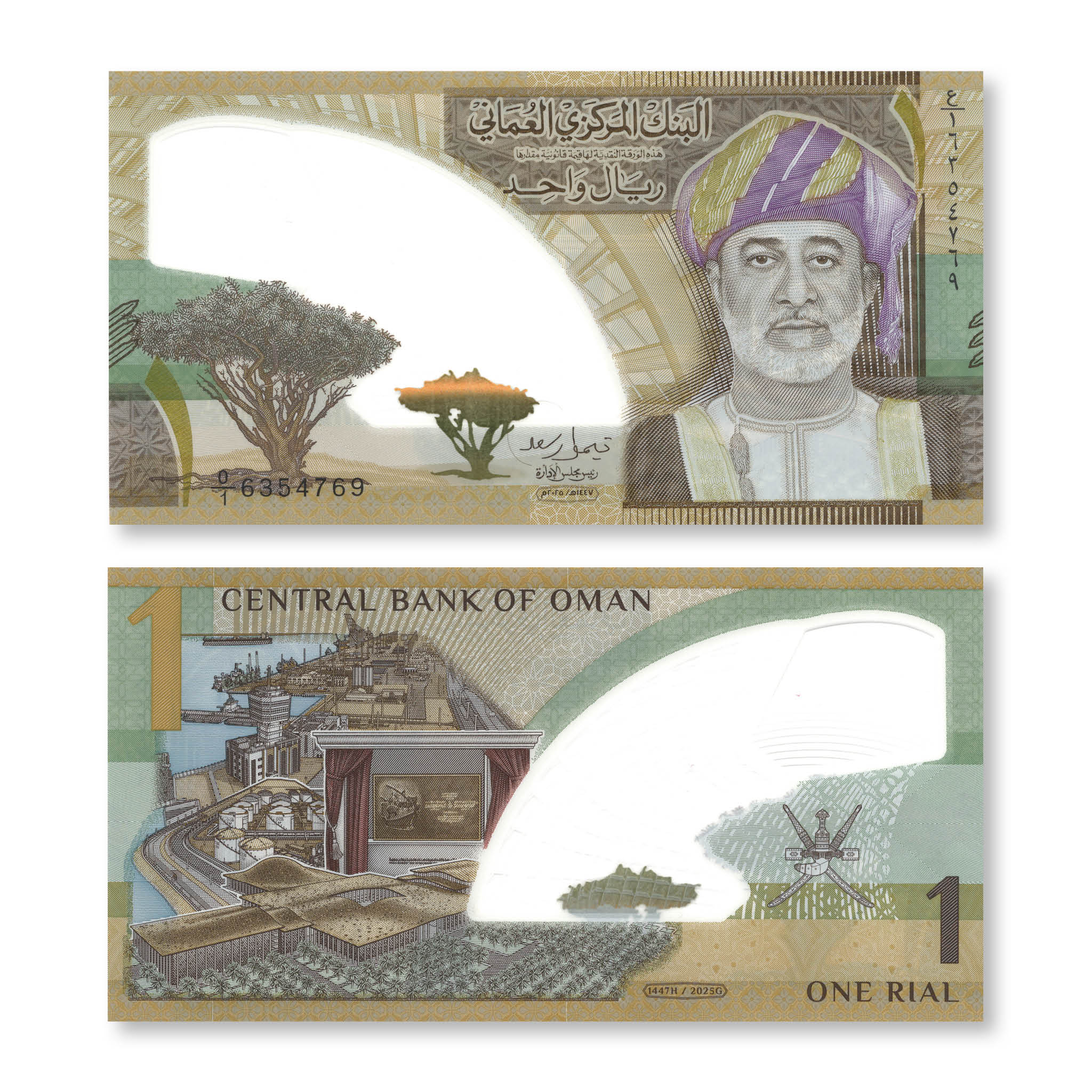 Back: Duqm port; Duqm refinery; Sayyid Tarik bin Taimour Cultural Complex;arched windows of the Oman Botanic Garden; coat of arms.