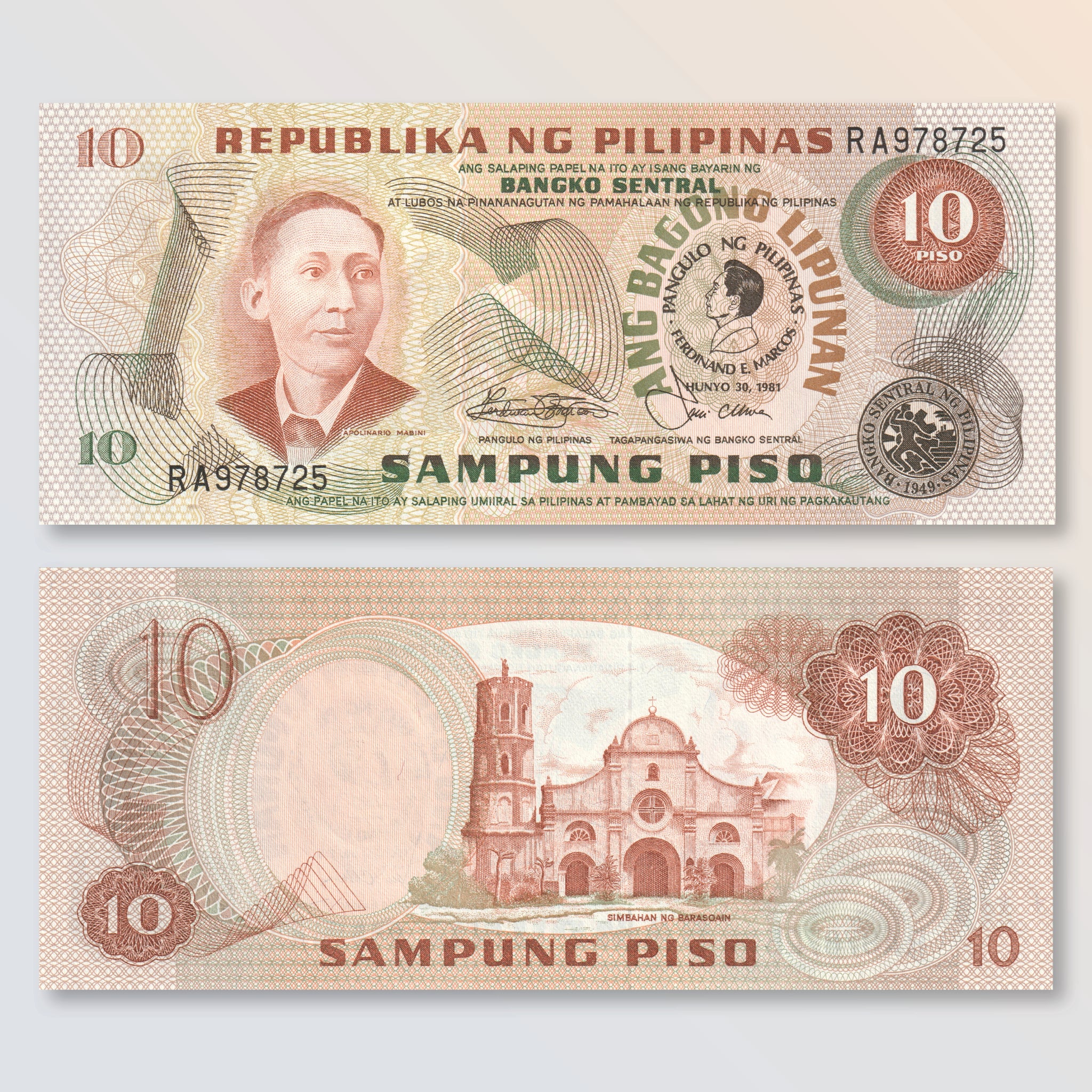 Front: Portrait of revolutionary and then first prime minister Apolinario Mabini; seal of the Bangko Sentral ng Pilipinas; Pangulo ng Pilipinas Ferdinand E. Marcos (President of the Philippines Ferdinand E. Marcos) overprint.