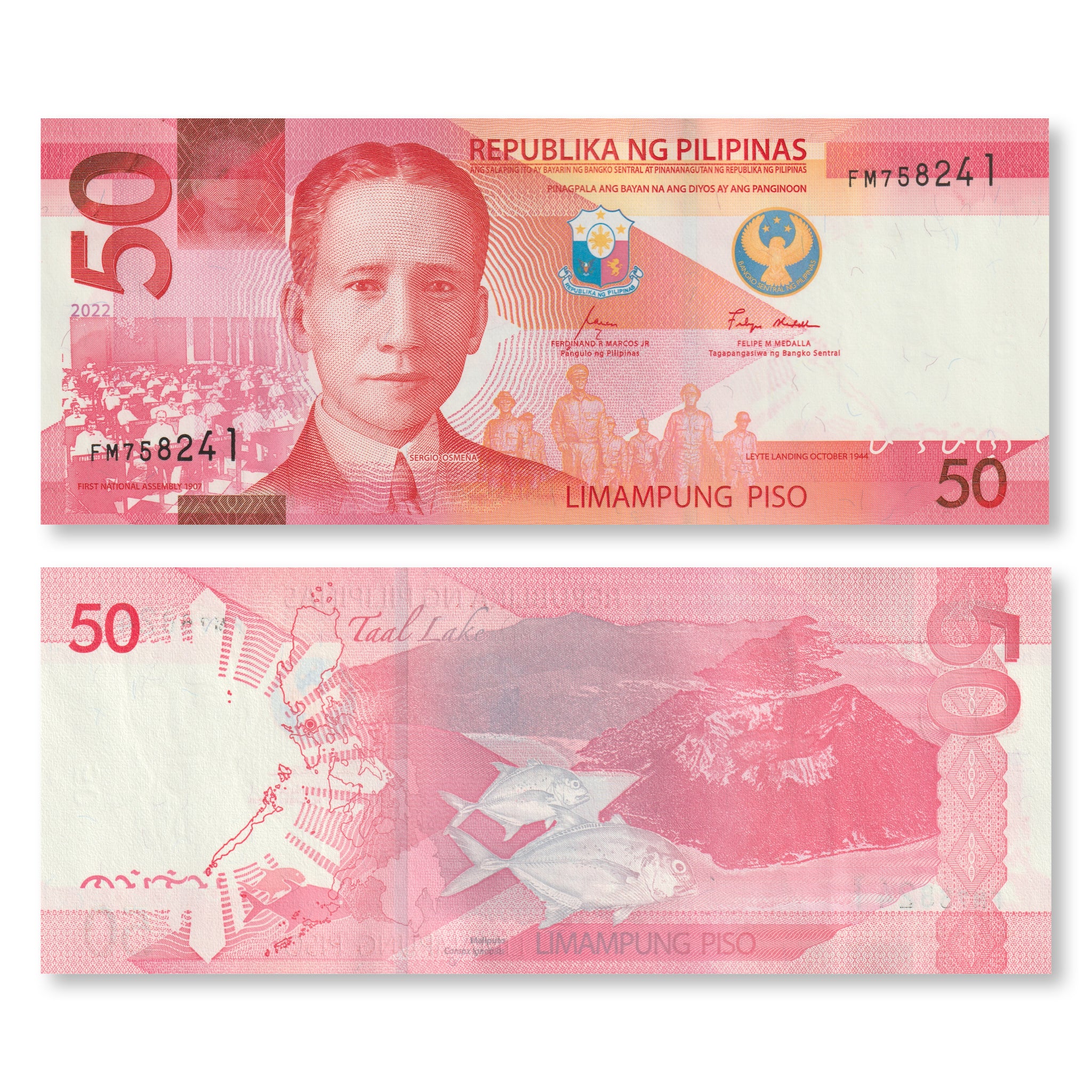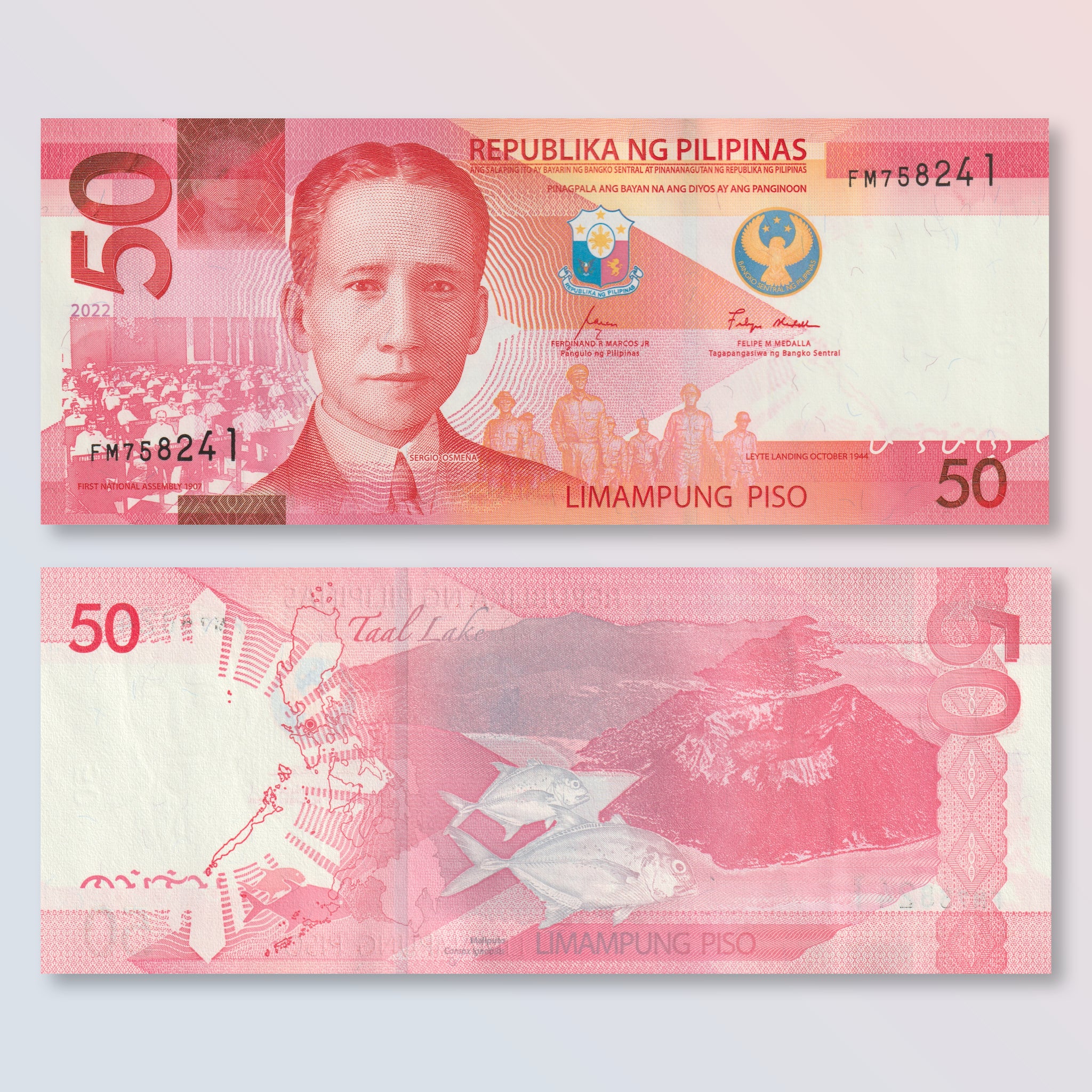 Front: Portrait of the fourth president of the Philippines, Sergio Osmeña; First national assembly in 1907; US General Douglas MacArthur during the Leyte Landing in 1944; seal of the Philippine president; new Bangko Sentral ng Pilipinas seal.