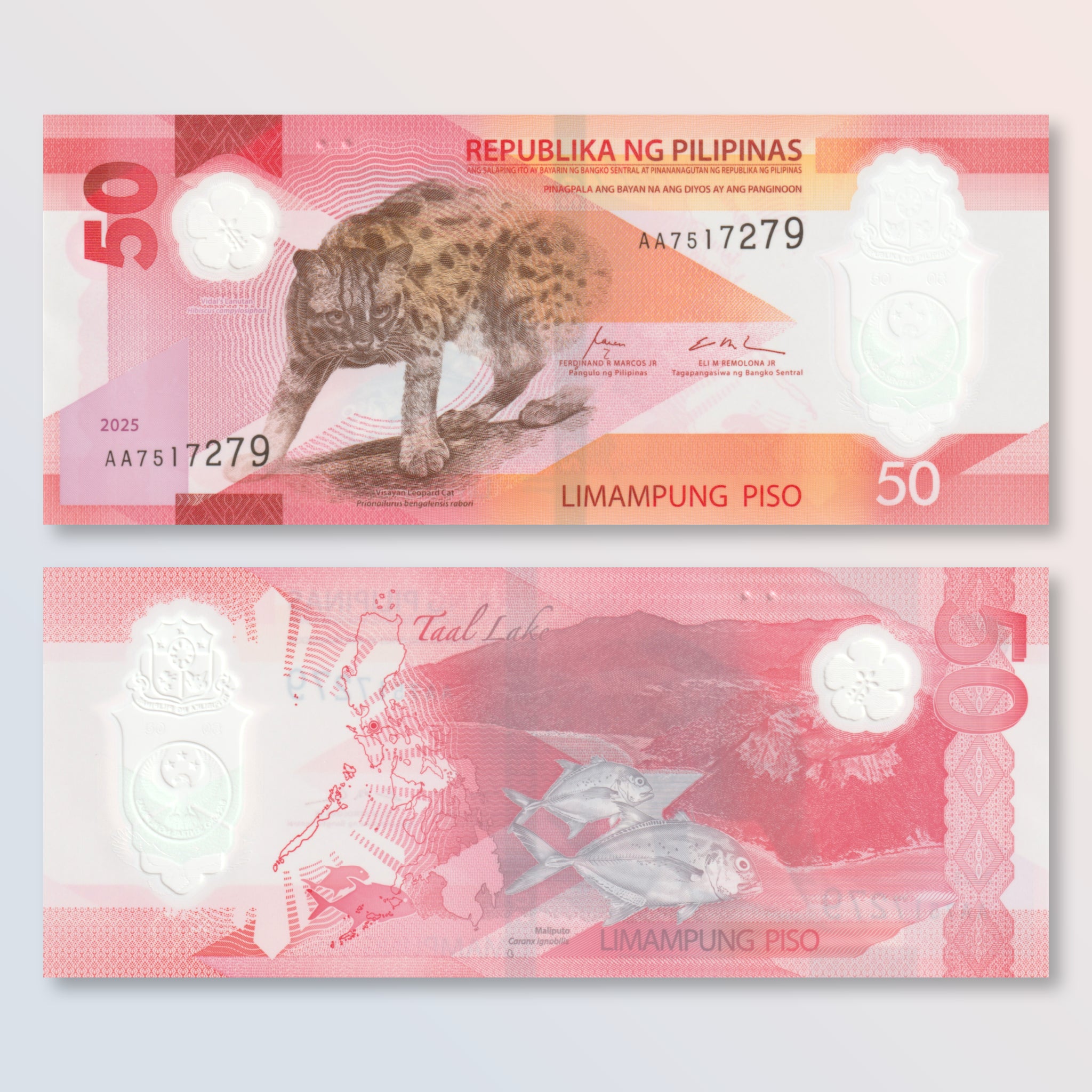 Front: Visayan leopard cat; Vidal's lanutan (Hibiscus campylosiphon) flower; Bangko Sentral ng Pilipinas seal.