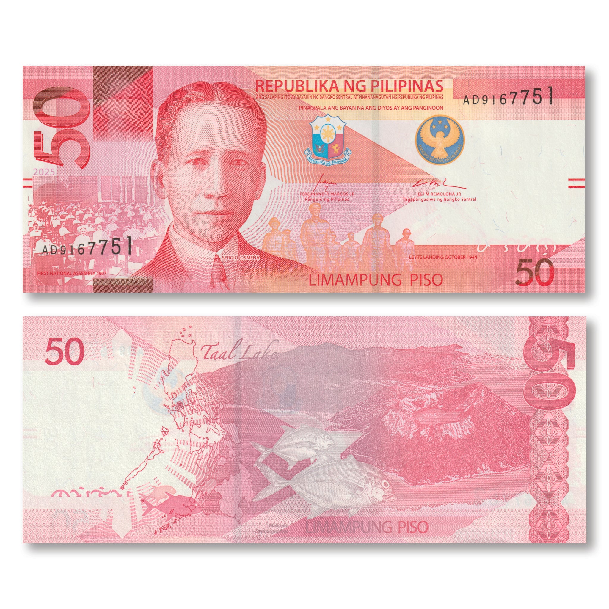 Front: Portrait of the fourth president of the Philippines, Sergio Osmeña; First national assembly in 1907; US General Douglas MacArthur during the Leyte Landing in 1944; seal of the Philippine president; new Bangko Sentral ng Pilipinas seal.