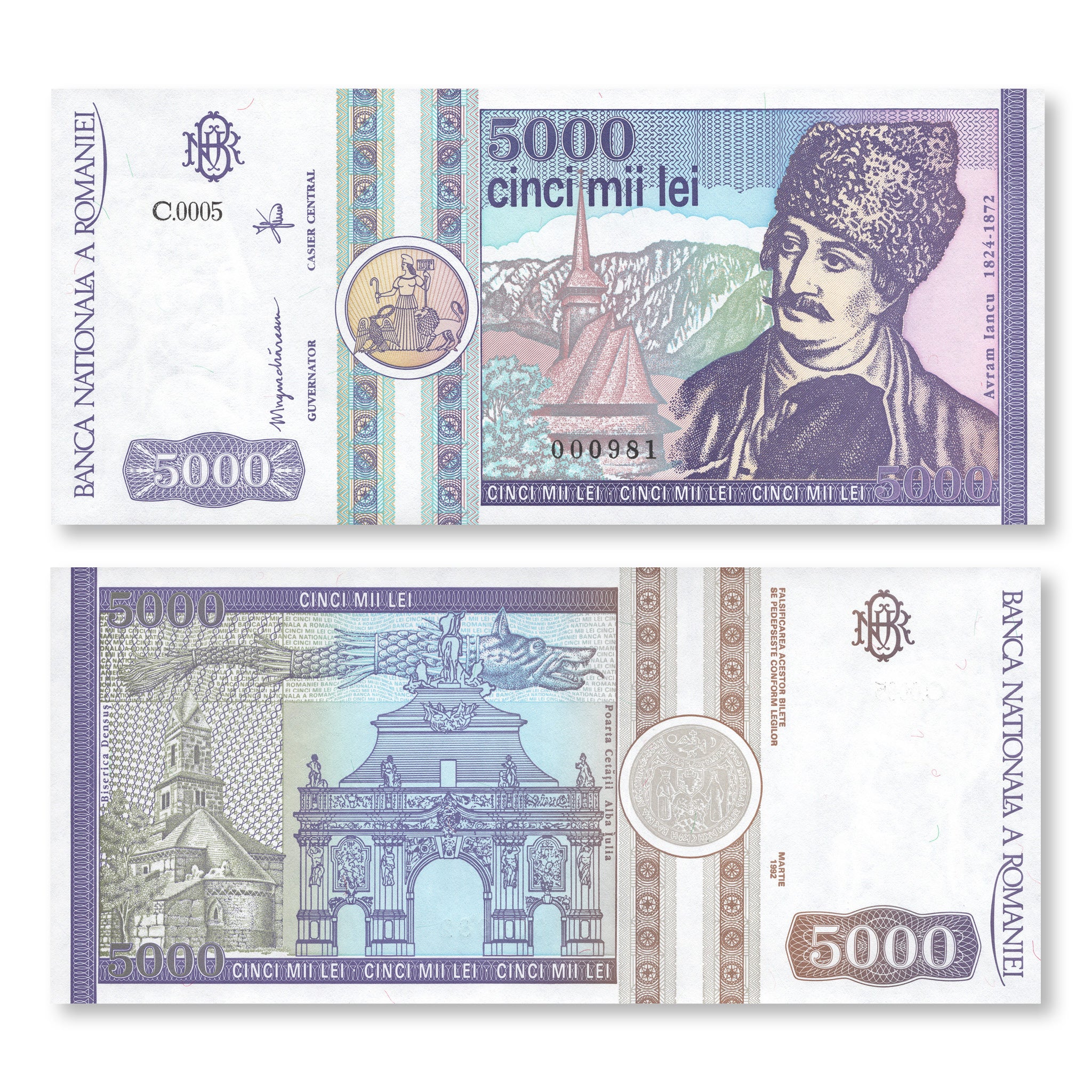 Front: Portrait of Avram Iancu, a Romanian intellectual who led the resistance against Hungarian domination in Transylvania in 1848-1849; BNA monogram; emblem of the 1848 Revolution (Dacia Felix); church and mountains in Maramures, Transylvania.