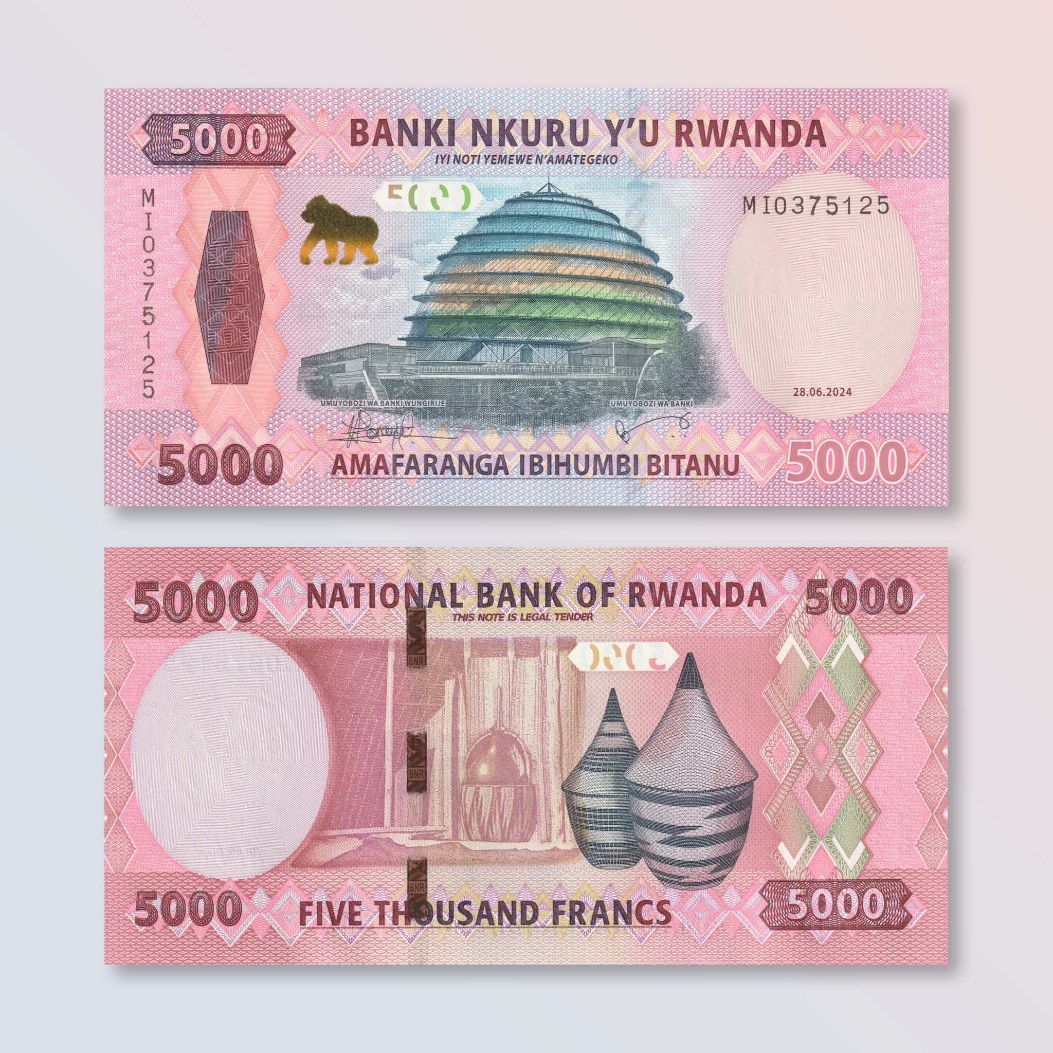 Front: Kigali Convention Center building in Kigali; gorilla in gold-to-green SPARK; denomination as registration device.