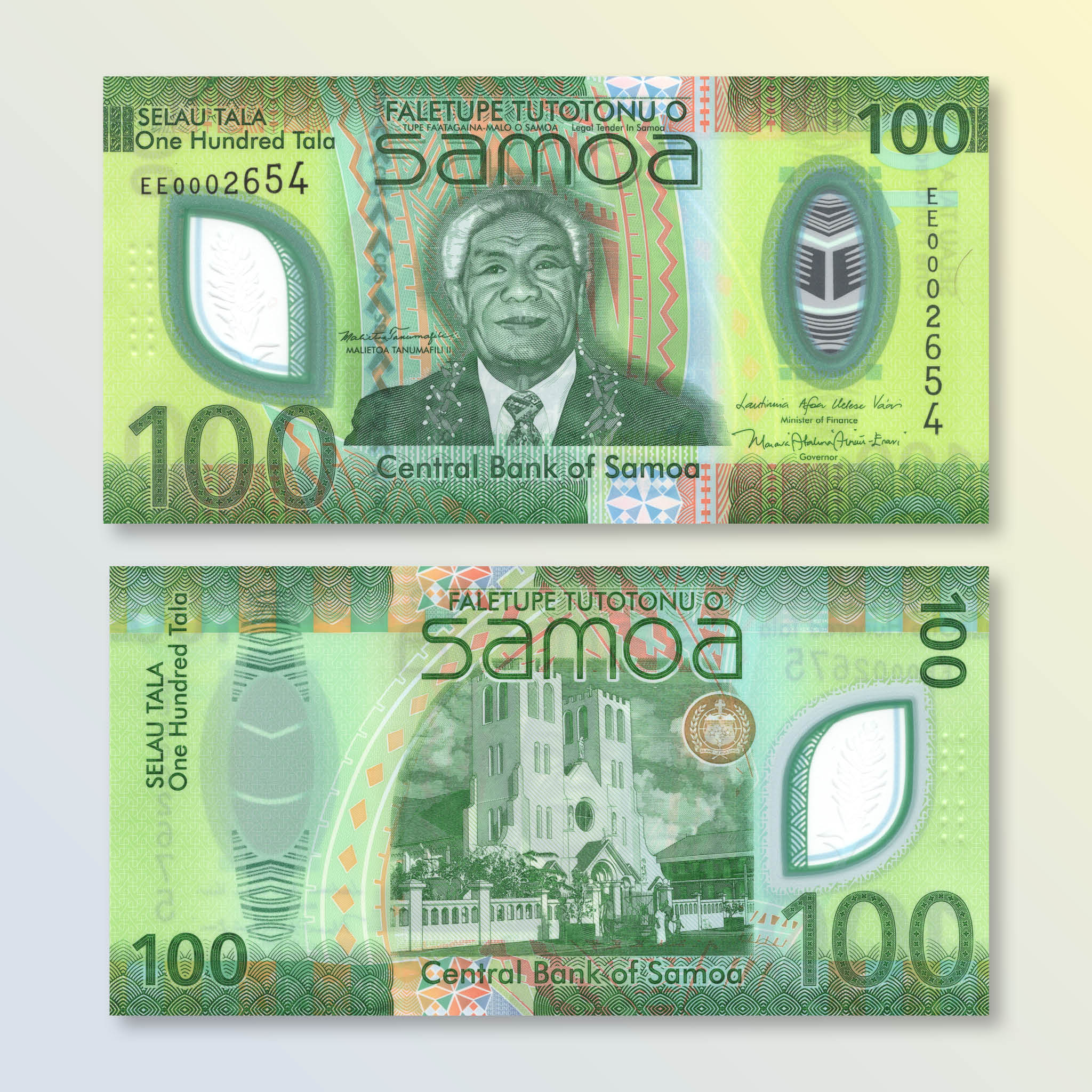 Back: The Mulivai Cathedral in Apia, one of the oldest Catholic cathedrals in Oceania, originally built in 1884. It was severely damaged in a 2009 earthquake, but restored and expanded and reopened in 2014. Samoan coat of arms.