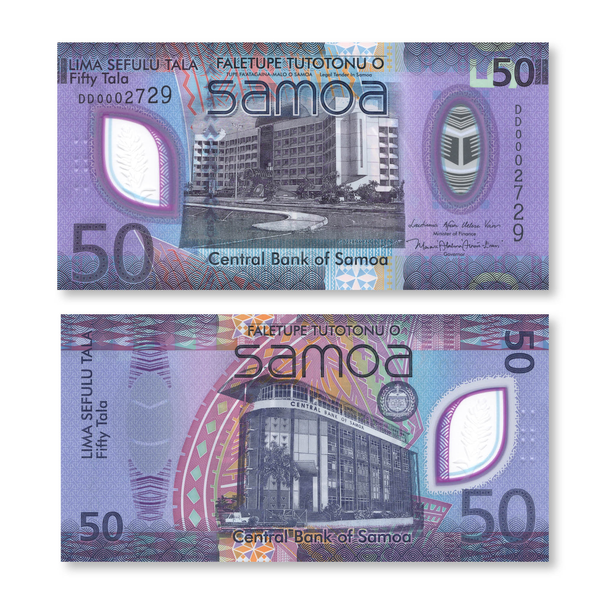 Back: The Central Bank of Samoa building; Samoan coat of arms.