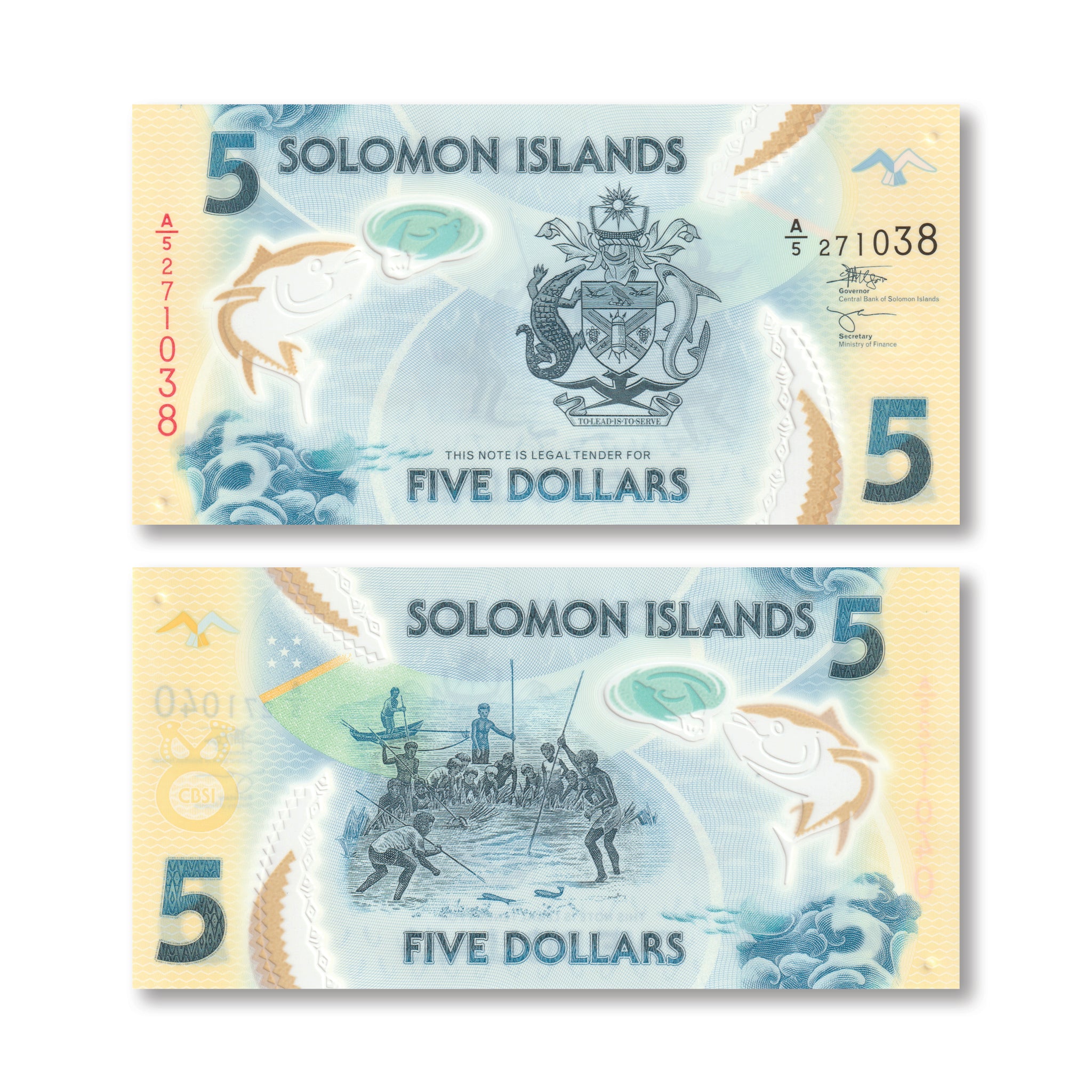 Front: Ocean waves and tuna fish; Solomon Islands coat of arms; seagull as registration device.