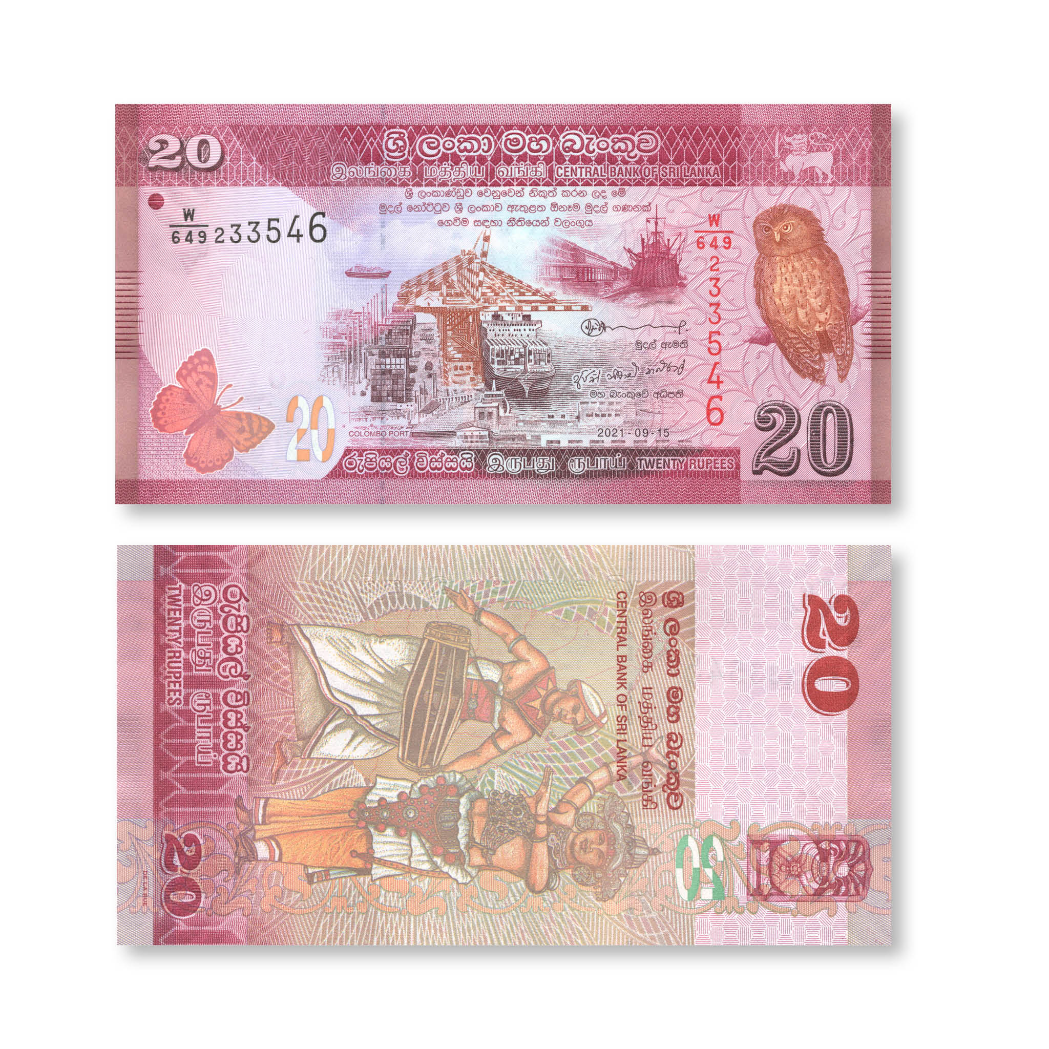 Front: Baronet butterfly; modern port of Colombo with ships, containers and gantry cranes; old port of Colombo with ship; Shri Lanka Serendib Scops Owl; lion holding sword.
