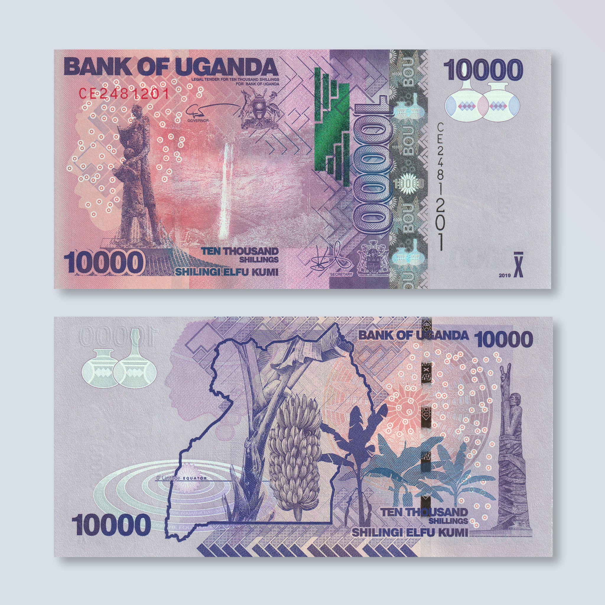 Back: Profile of a man wearing Karimojong headdress; sun, map, bird’s nest; weaver birds; National Independence monument in Kampala. Red-to-green windowed security thread with demetalized BOU V.