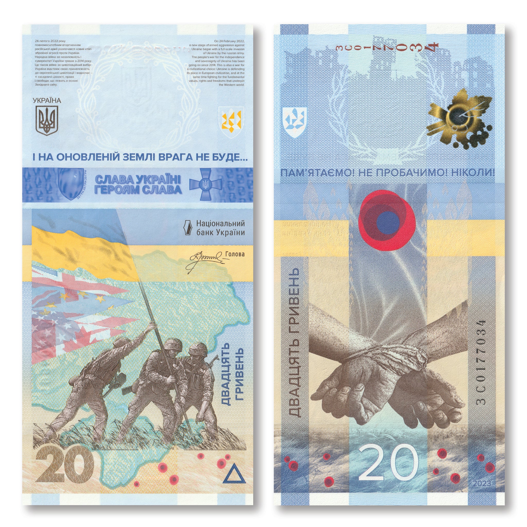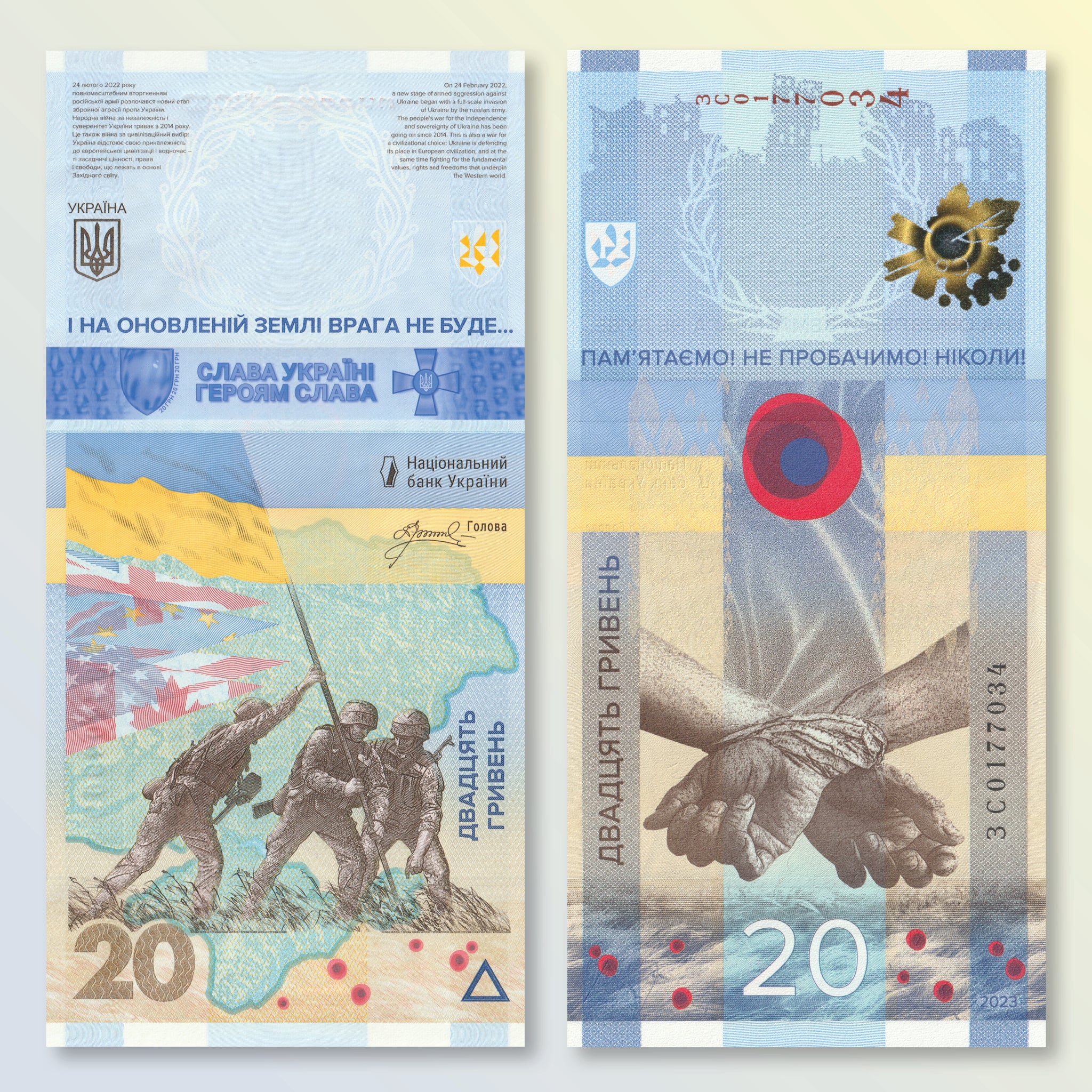 Front: Ukrainian coat of arms; the flags of allies United Kingdom, European Union, United States, and Canada; Olexandr Smirnov's photo of three Ukrainian soldiers hoisting the Ukrainian state flag; a fragment of the map of Ukraine; stylized steppe with poppies symbolizing Ukraine's dead defenders; laurel wreath; symbol of hryvnia; logotype of the National Bank of Ukraine; sholder patch of Ukraine's armed forces; emblem of Ukraine's armed forces; coat of arms as registration device.