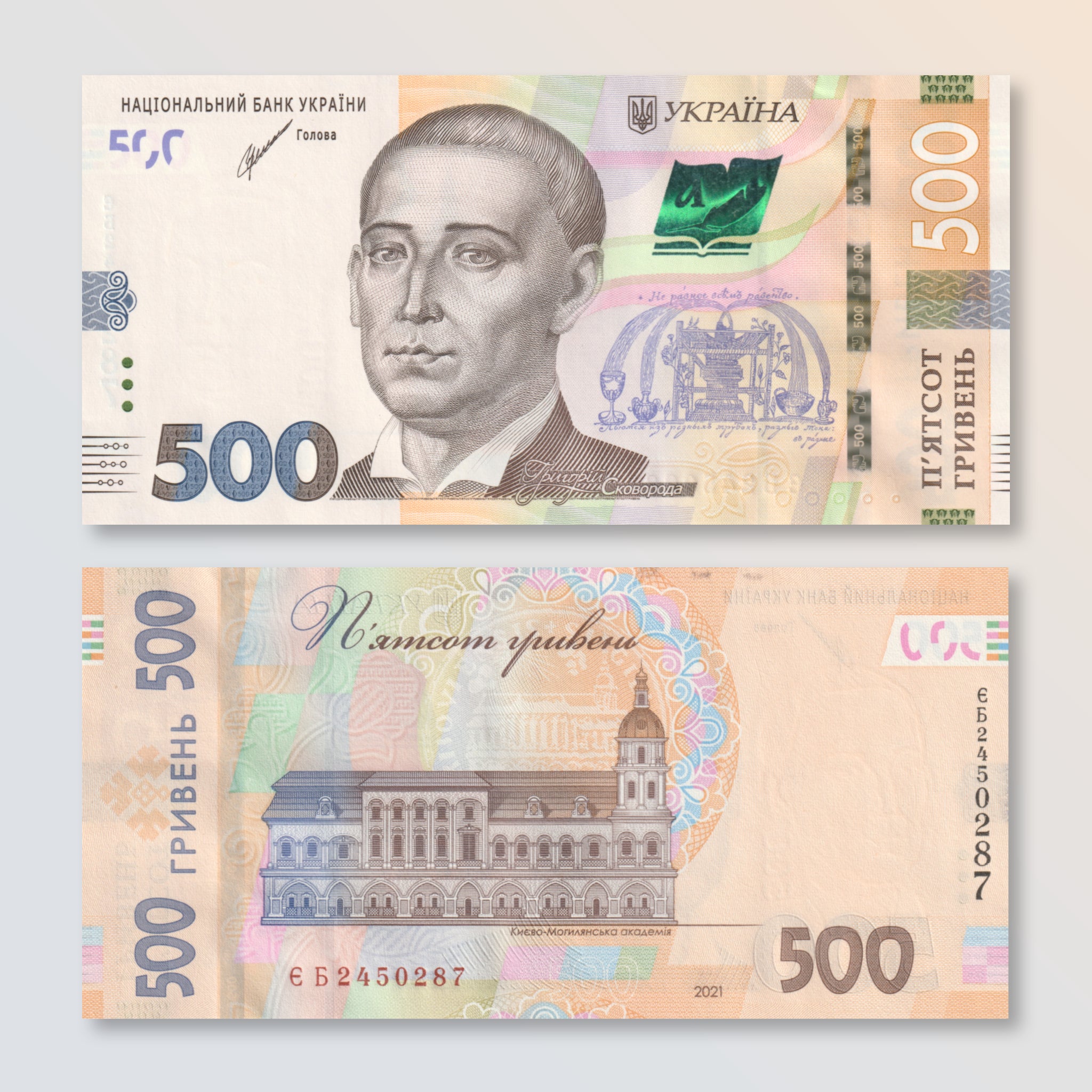 Front: Portrait of musician Hryhorii Skovoroda; denomination as registration device; Ukrainian coat of arms; fountain; open book with quill in gold-to-green SPARK.