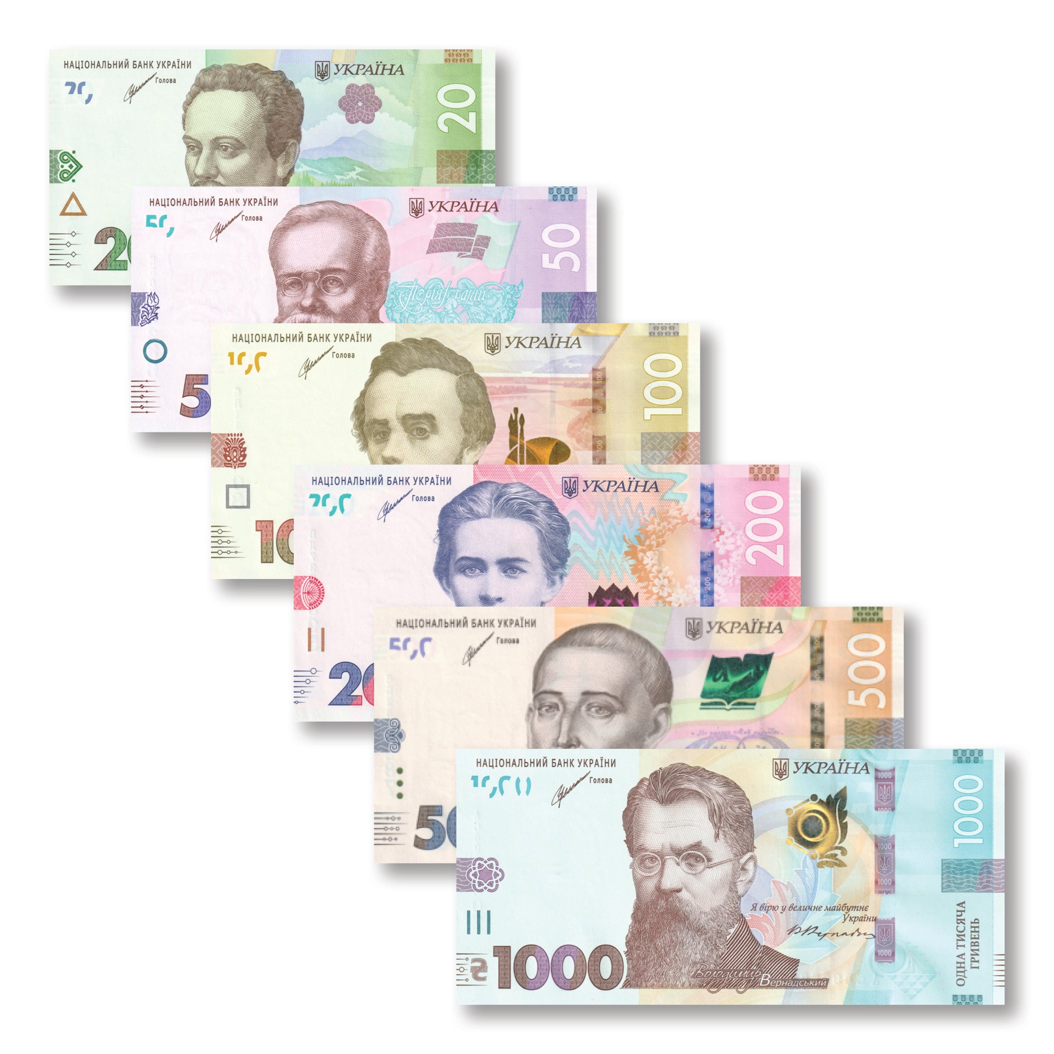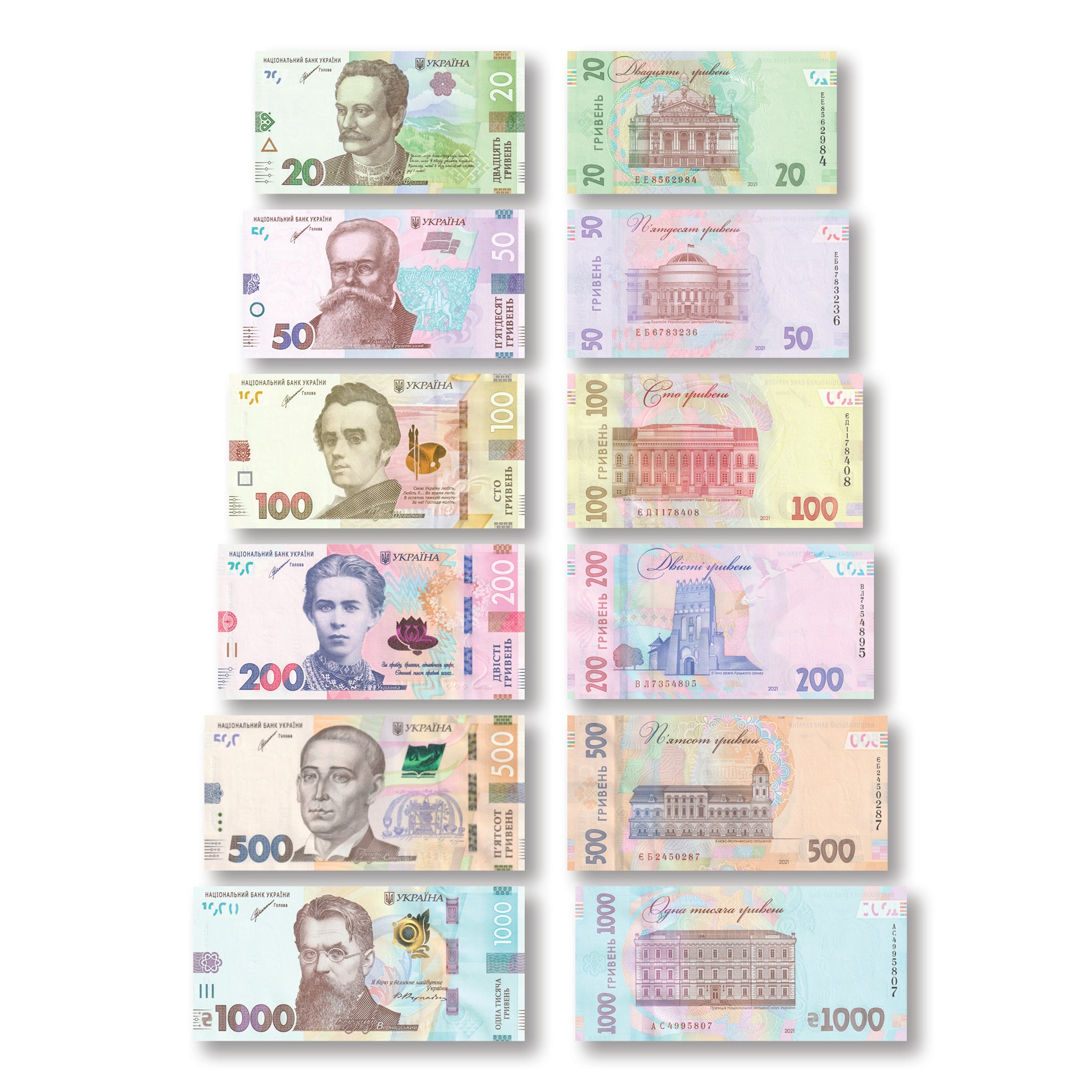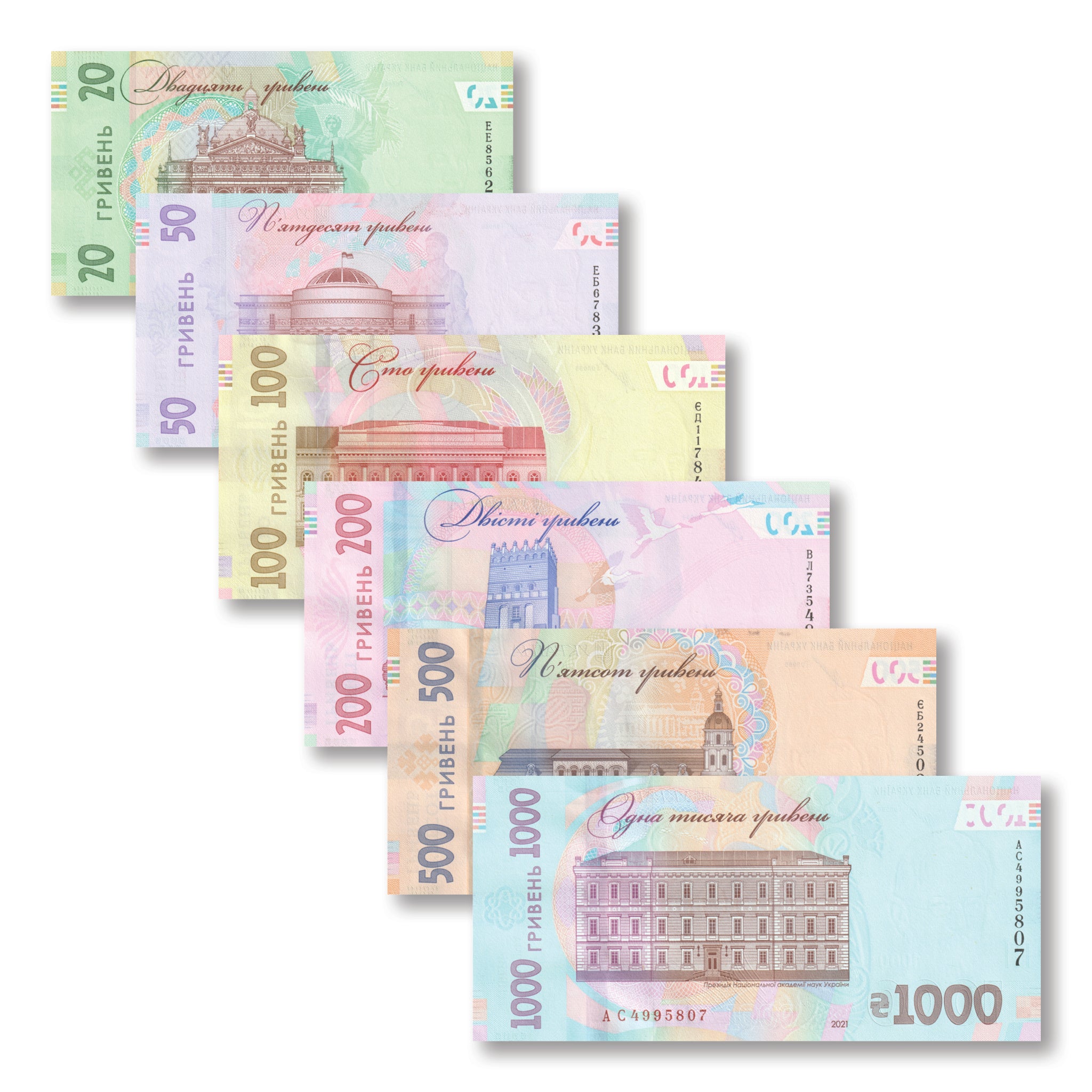 This full set of current Ukraine regular issues contains six banknotes, one each of: