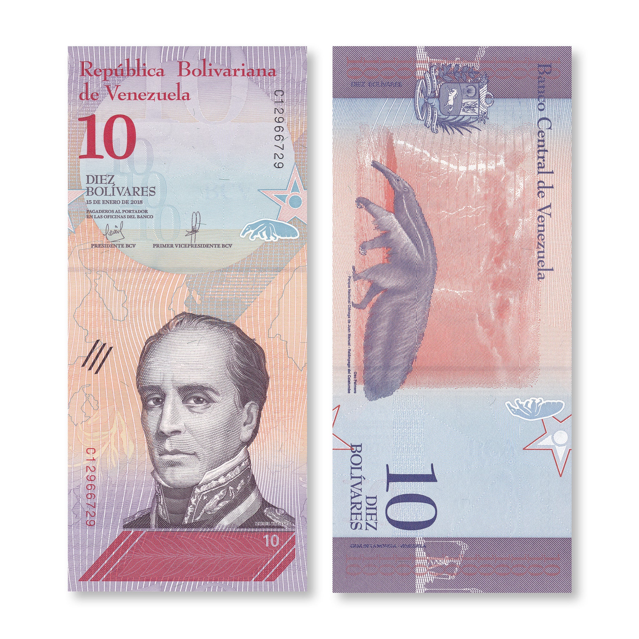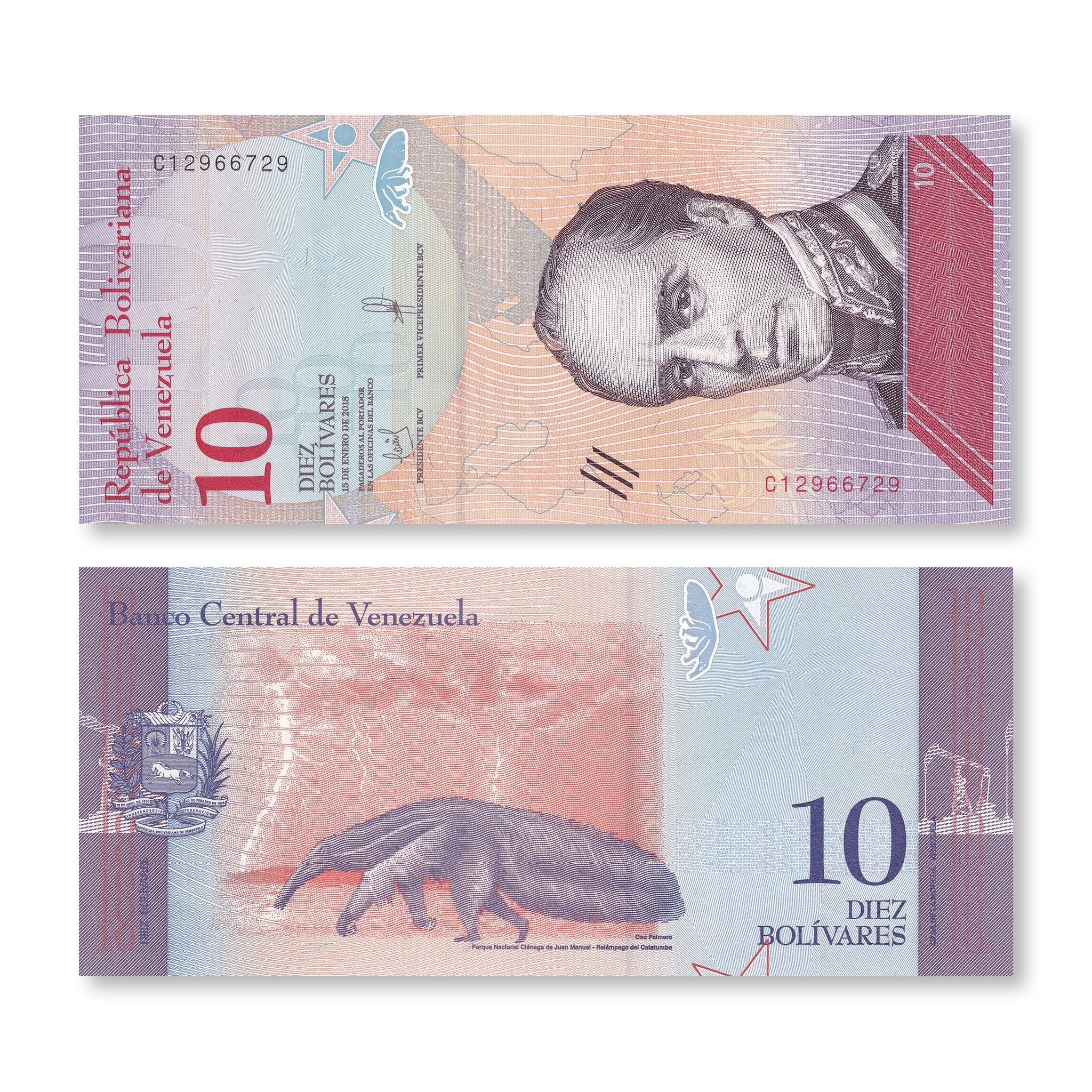 Back:  Giant anteater; Cienagas de Juan Manuel National Park; lightning over the Catatumbo river; pump jack; Venezuelan coat of arms.