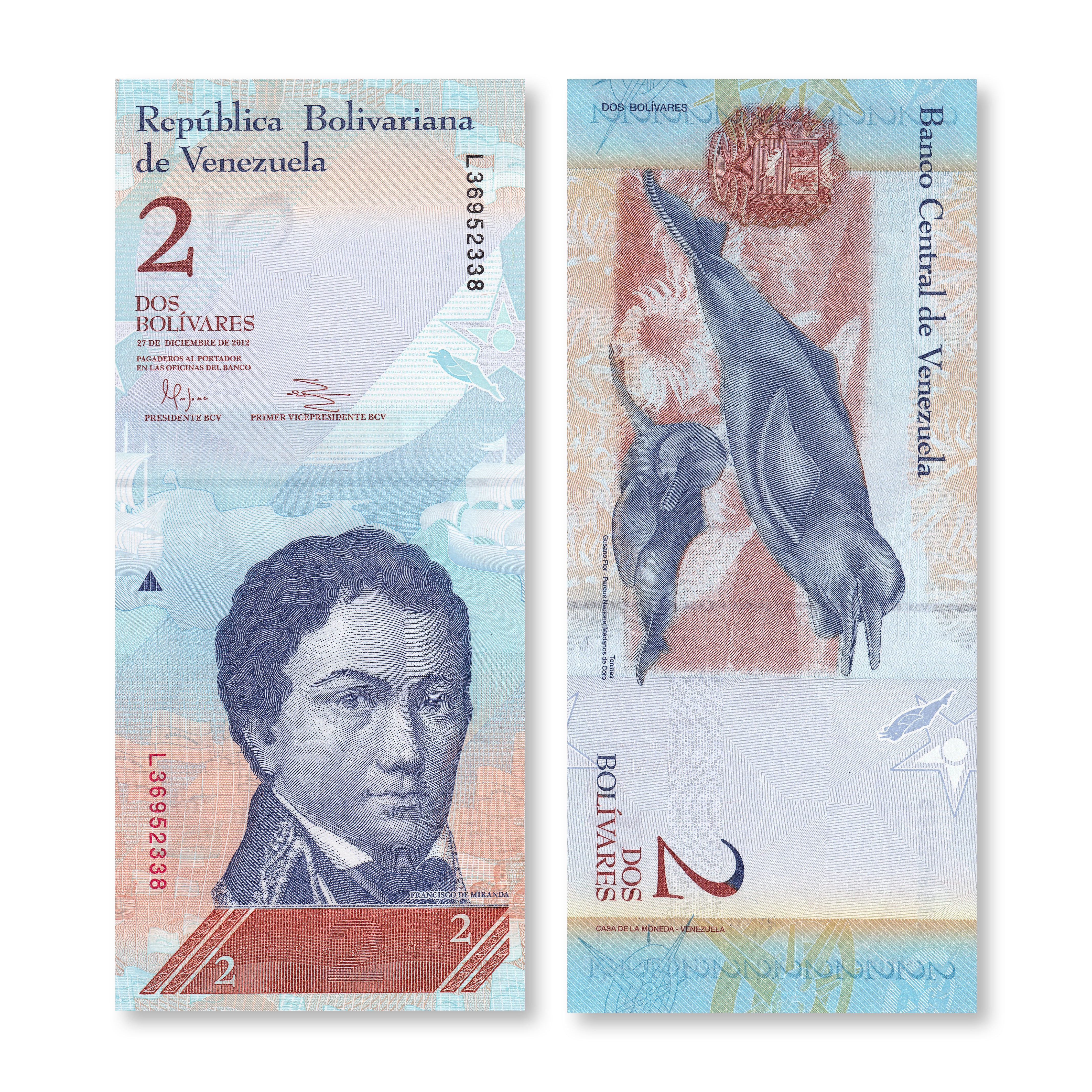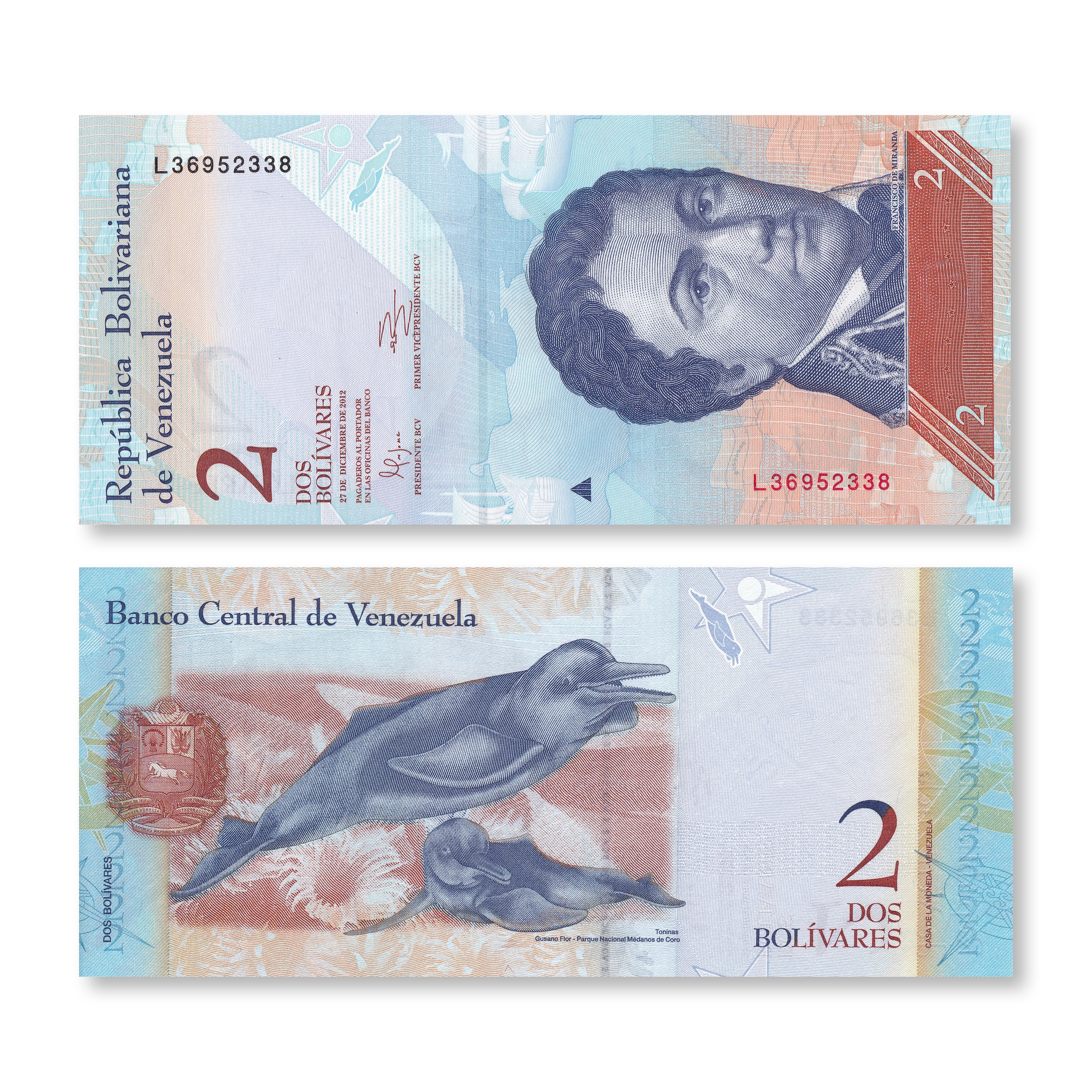 Back:  Two Amazon river dolphin (Inia geoffrensis); Parque Nactional Medanos de Coro; gusano flor; Venezuelan coat of arms.