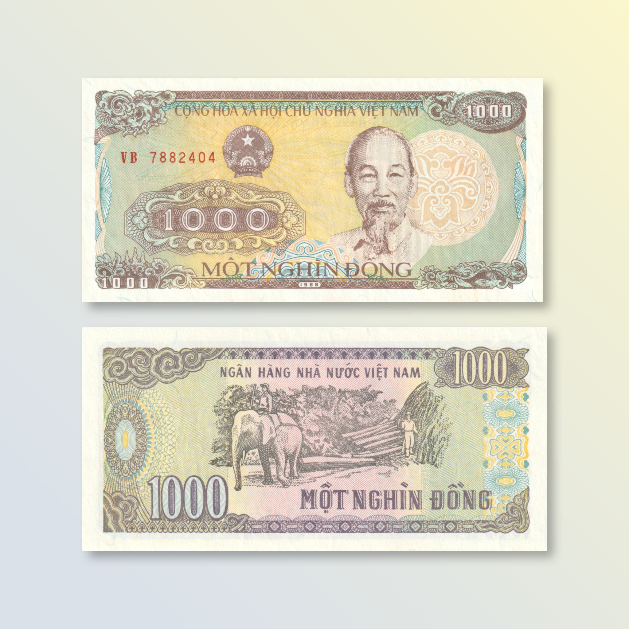 Front: Portrait of Ho Chi Minh (1890–1969), prime minister of North Vietnam from 1945–1955 and president from 1945 until his death in 1969. Vietnamese coat of arms.