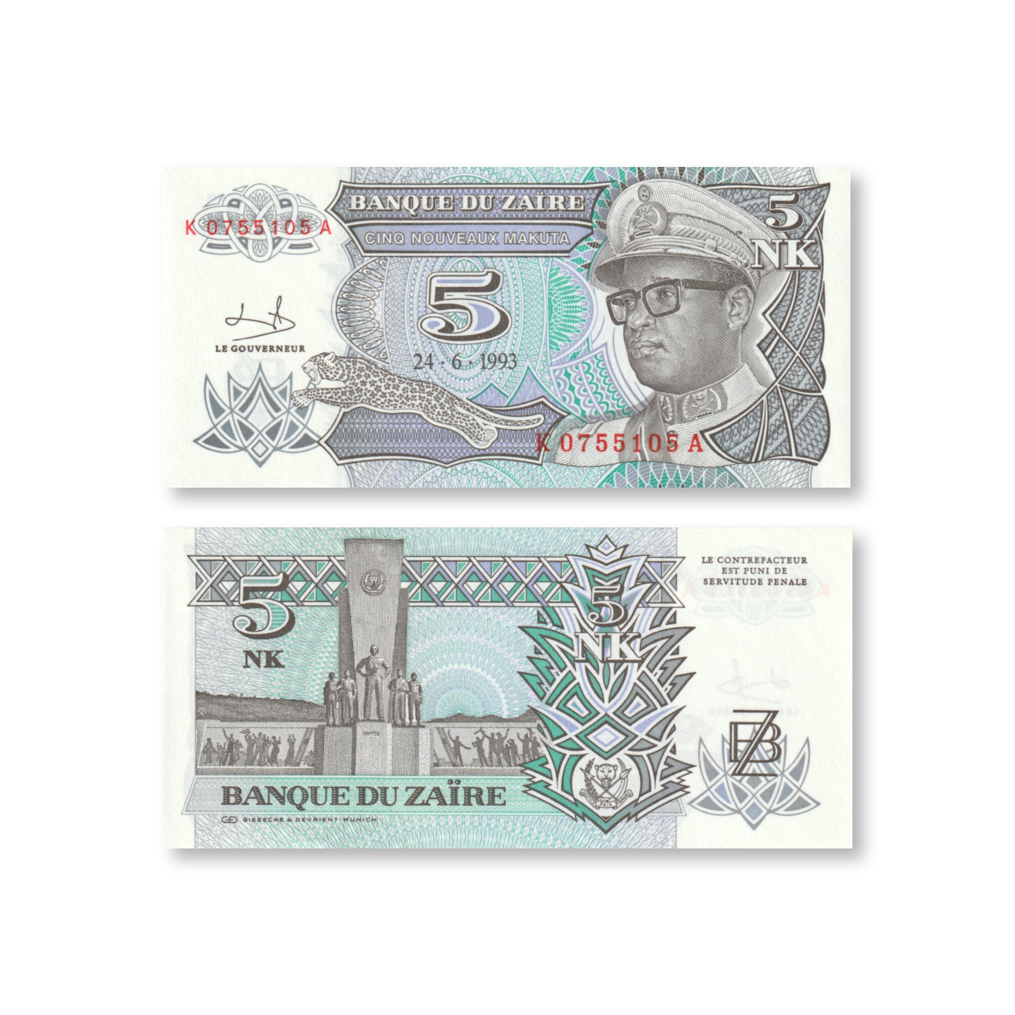 Front: Mobuto Sese Seko in uniform with cap; leopard.