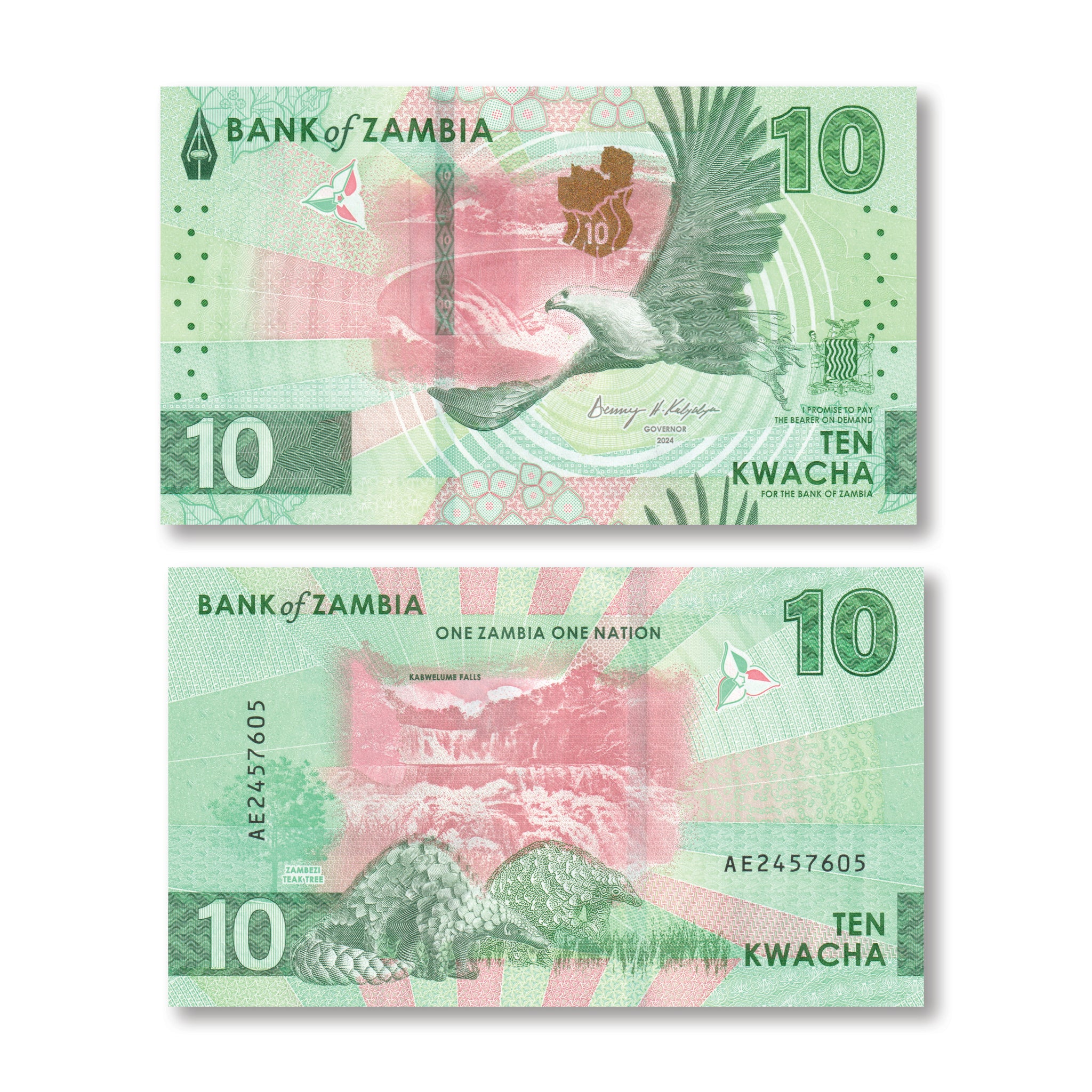 Front: Fish eagle in flight; Bank of Zambia logo; flower as registration device; Kariba Dam on the Zambezi River; map of Zambia in bronze OVI; Zambian coat of arms.